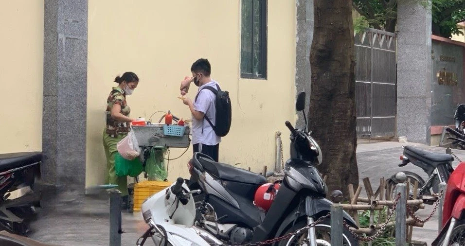 Học sinh mua đồ ăn trước cổng trường THCS Quỳnh Mai (Hà Nội).