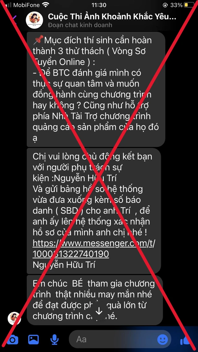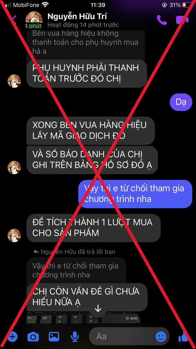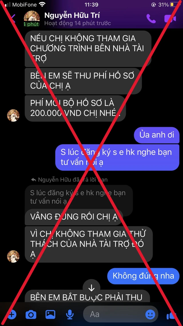 Khi thấy dấu hiệu lừa đảo, vị phụ huynh này từ chối không muốn tham gia thì người phụ trách yêu cầu phải thanh toán 200.000 đồng phí hồ sơ đăng ký. Đối tượng này còn đưa ra những hình ảnh cắt ghép căn cước công dân và thẻ "nhân viên sự kiện của VTV" để tạo lòng tin.