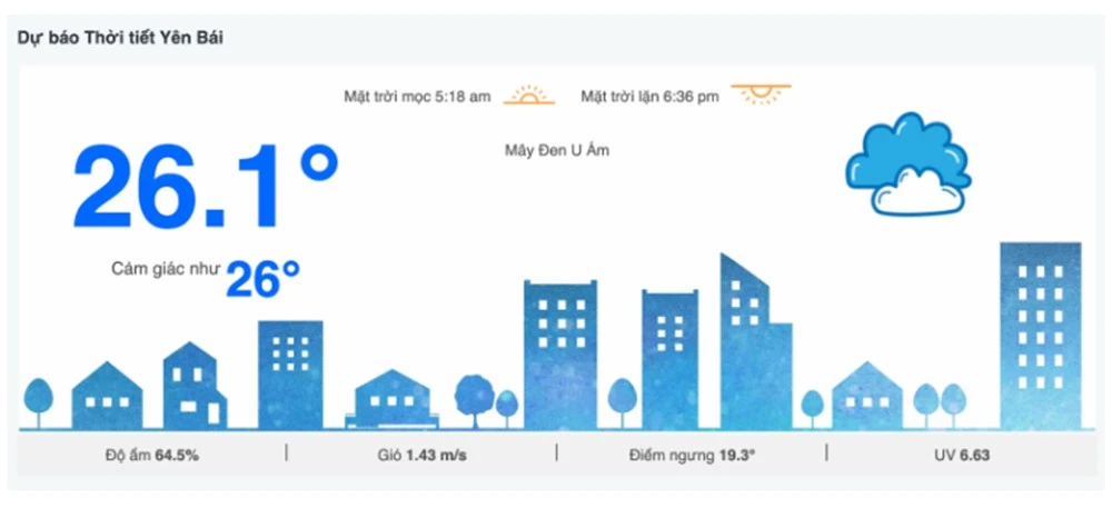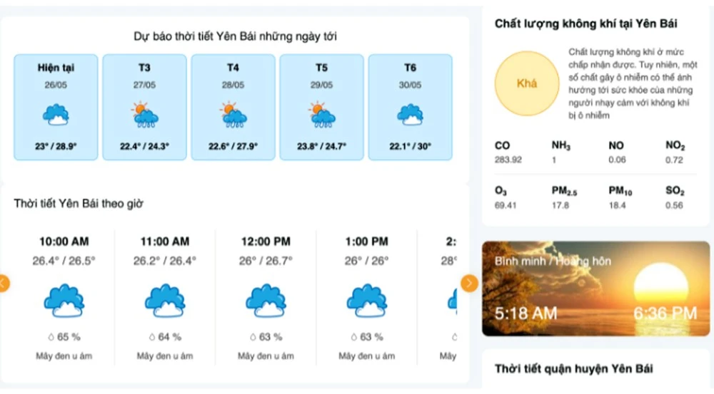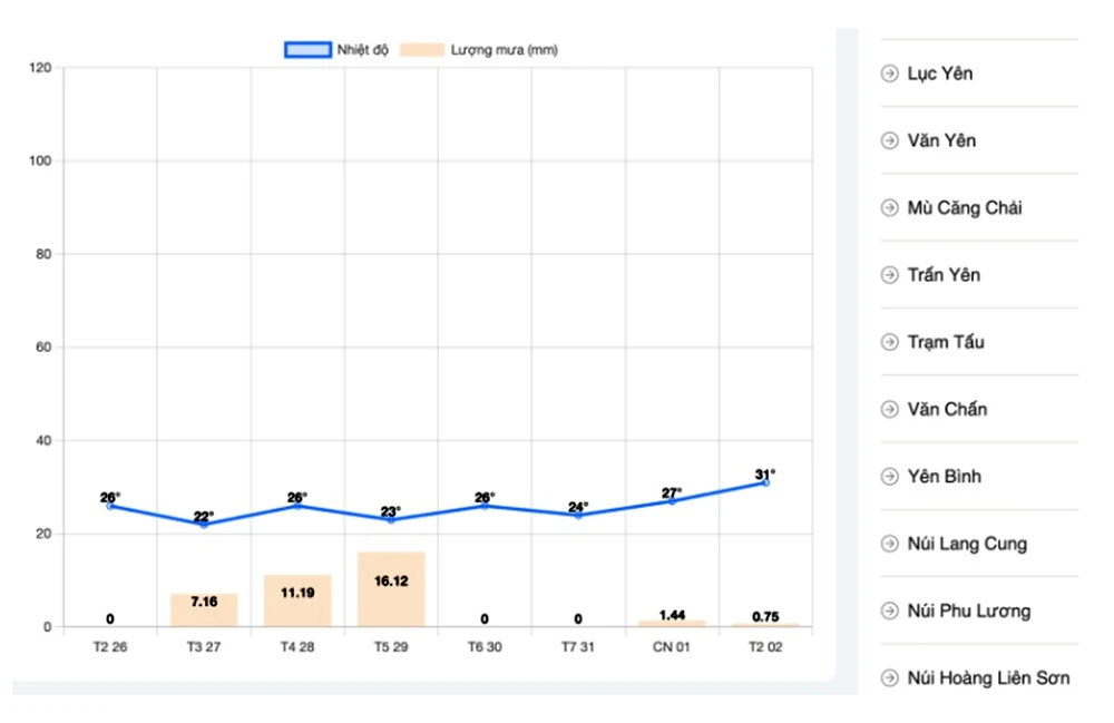 Giữa rất nhiều nguồn dự báo thời tiết hiện nay, DBTT.edu.vn nổi bật nhờ tính chuyên biệt, giao diện dễ sử dụng và dữ liệu được cập nhật liên tục. Đây là website chuyên cung cấp thông tin thời tiết theo khu vực, trong đó đặc biệt chú trọng tới Yên Bái, từ trung tâm thành phố đến các huyện như Văn Chấn, Trạm Tấu, Mù Cang Chải… Tại chuyên mục Dự báo thời tiết Yên Bái, người dùng có thể theo dõi đầy đủ: