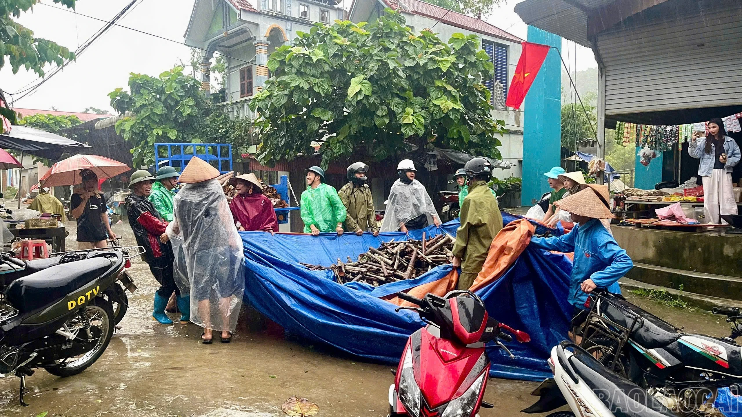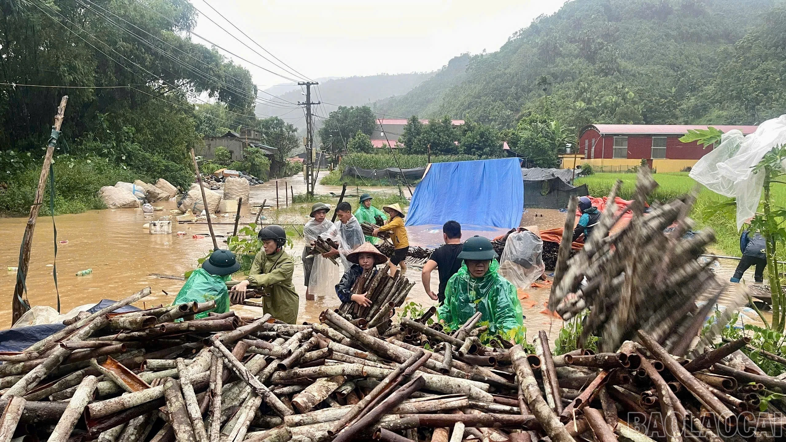 Các lực lượng hỗ trợ Nhân dân di chuyển quế ra khỏi vùng mưa lũ.