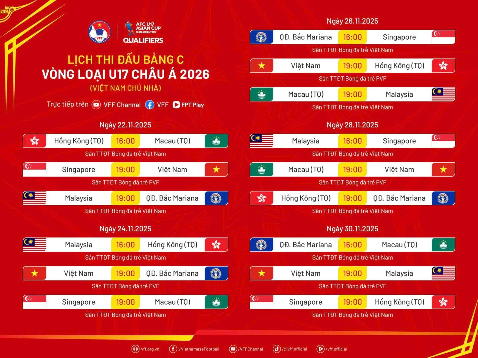 Lịch thi đấu của tuyển Việt Nam tại vòn loại giải vô địch bóng đá U17 châu Á 2026: