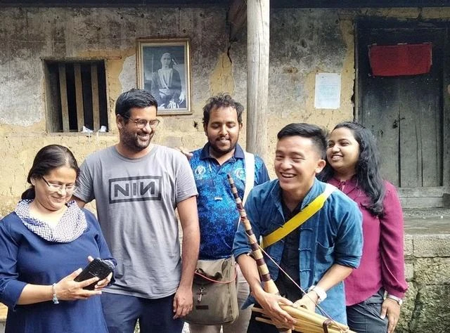 Anh Sùng Mí Phìn và mẹ (thứ 2 từ trái qua) dẫn du khách đi trải nghiệm lao động của đồng bào Mông trên núi cao.
