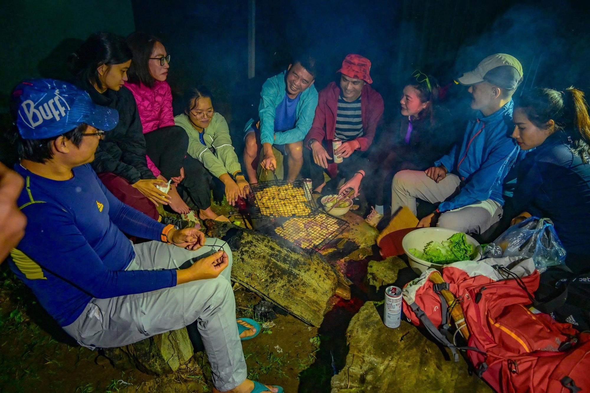 Mặt trời lặn dần, chúng tôi cũng tới lán, nơi các bạn porter đang chuẩn bị bữa tối. Bữa tiệc BBQ giữa núi rừng dù lặp lại bao lần, lần nào cũng háo hức như lần đầu soạn tiệc.