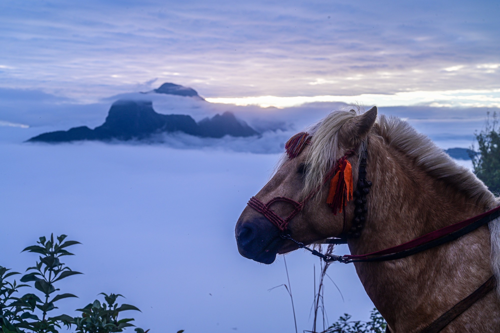 Càng lên cao, bầu trời hé rạng những tia sáng xanh le lói, các lớp mây dần lộ ra, đoàn chúng tôi vỡ òa trong khoảnh khắc bắt gặp những đụn mây trắng xóa, bồng bềnh ôm lấy non cao. Thêm chú ngựa lững thững giữa thênh thang núi, khiến khung cảnh thiên nhiên càng thêm thơ mộng.