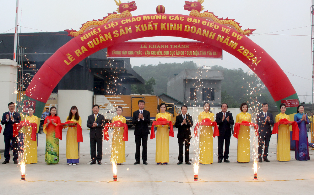 Các đồng chí lãnh đạo tỉnh cắt băng khánh thành Trung tâm Khai thác - vận chuyển và Bưu cục Âu Cơ tại thôn Văn Phú, xã Văn Phú, thành phố Yên Bái tại Lễ ra quân sản xuất, kinh doanh năm 2024.
