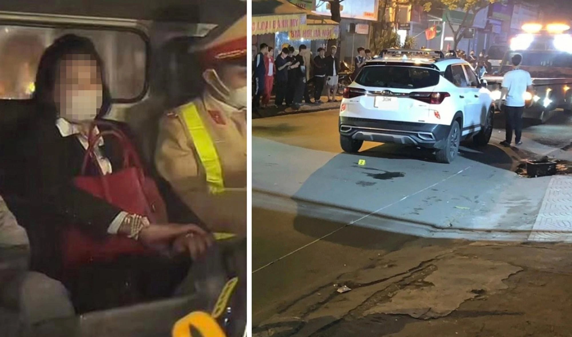 Lực lượng chức năng đưa nữ tài xế ô tô đi kiểm tra nồng độ cồn sau khi xảy ra va chạm với xe máy tại phố Trần Cung, Hà Nội.