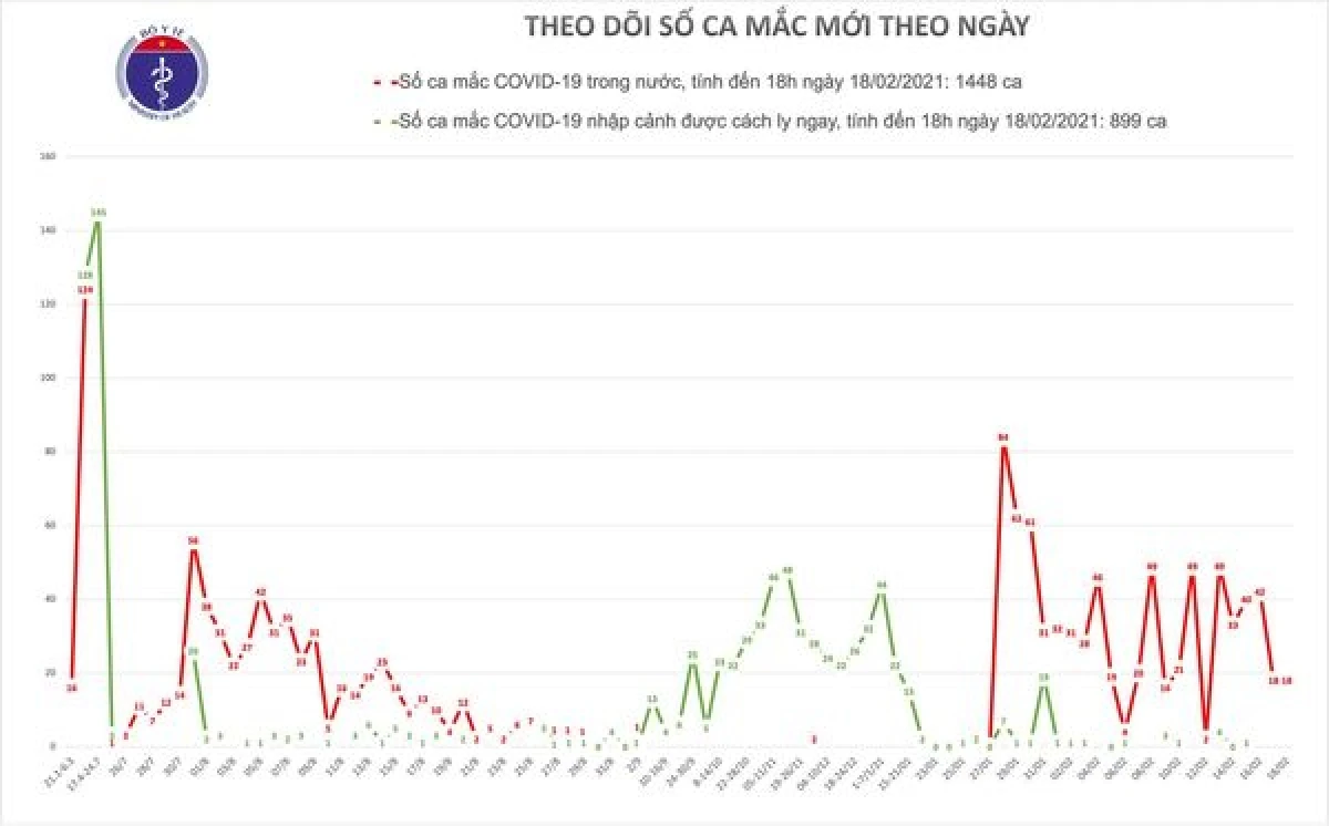 Tính đến 18h chiều 18/2, Việt Nam có tổng cộng 1.448 ca COVID-19 lây nhiễm trong nước, trong đó, số ca mắc tính từ ngày 27/1 đến nay là 755 người./.