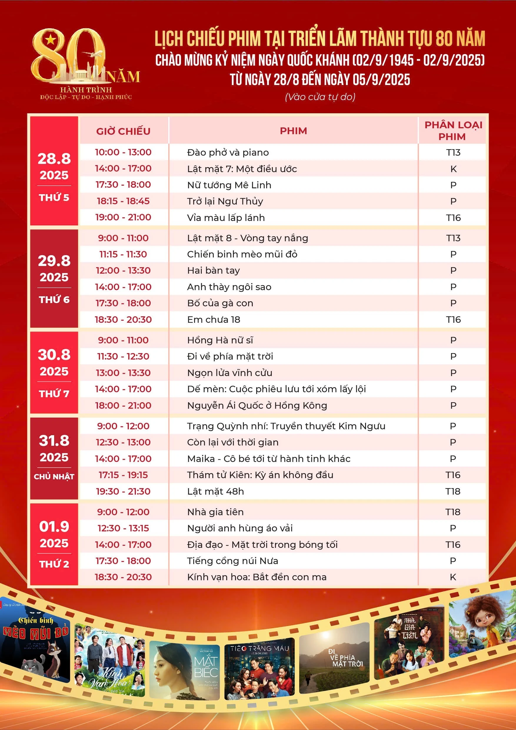 Nhân kỷ niệm 80 năm Cách mạng Tháng Tám và Quốc khánh 2/9, từ ngày 28/8 - 5/9, tại rạp chiếu phim Nhà A, Trung tâm Hội chợ Triển lãm Quốc gia (Đông Anh, Hà Nội), sẽ trình chiếu miễn phí 50 tác phẩm điện ảnh của Việt Nam và giao lưu với các nghệ sĩ, diễn viên.