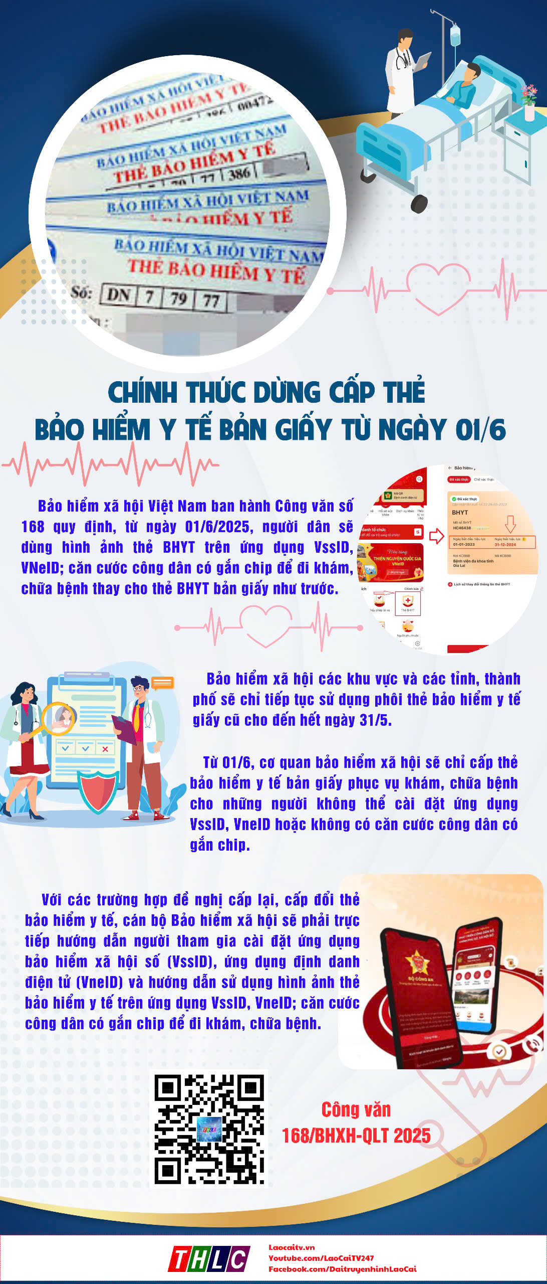 Laocaitv.vn - Bảo hiểm xã hội Việt Nam ban hành Công văn số 168 quy định, từ ngày 01/6/2025, người dân sẽ dùng hình ảnh thẻ BHYT trên ứng dụng VssID, VNeID; căn cước công dân có gắn chip để đi khám, chữa bệnh thay cho thẻ BHYT bản giấy như trước.