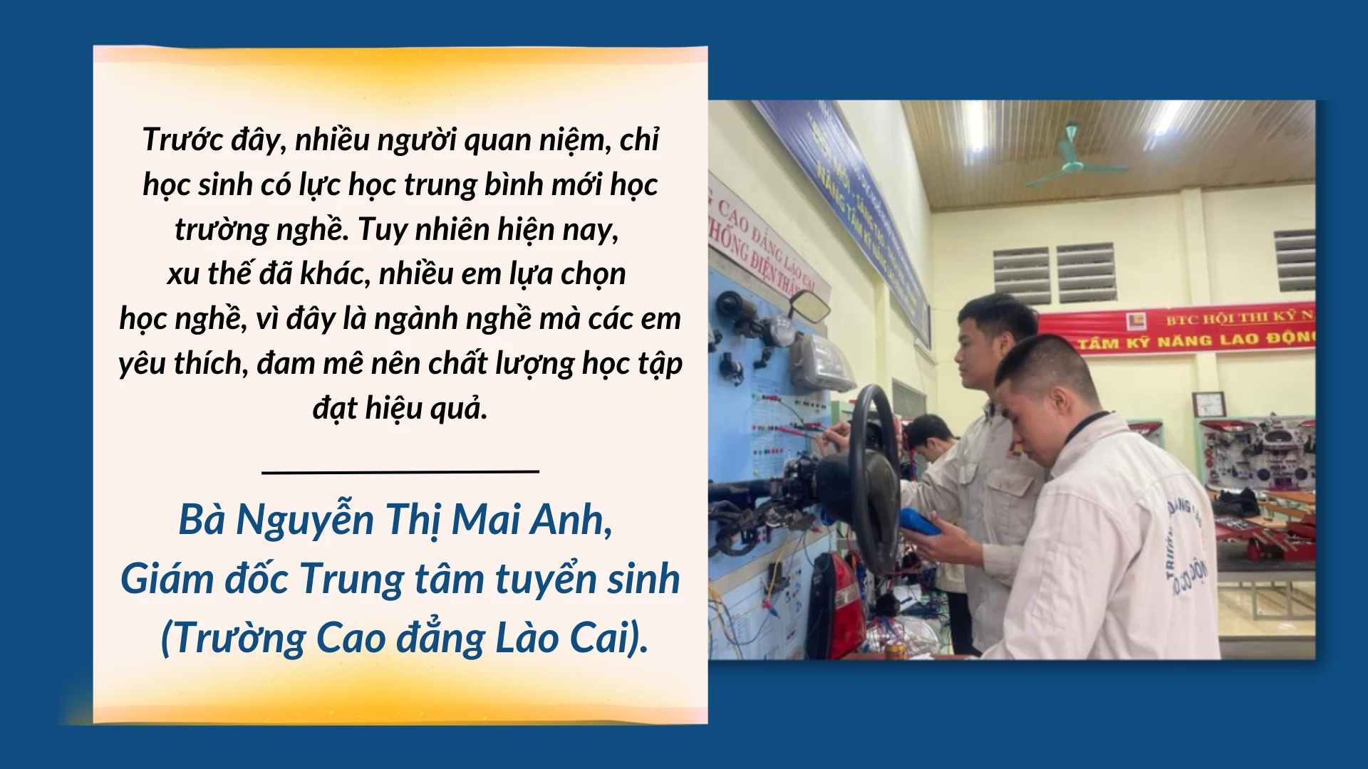 Tương tự như Quỳnh Nga, bạn Triệu Ông Nhất (huyện Văn Bàn), từng có học lực khá ở bậc THPT cũng chia sẻ rằng, không mất quá nhiều thời gian để quyết định theo học nghề công nghệ ô tô, bởi đây là ngành nghề mà em đam mê và yêu thích từ lâu. Nhờ quyết tâm và chăm chỉ học tập, trau dồi kiến thức, sau thời gian học tập tại Trung tâm Giáo dục nghề nghiệp - Giáo dục thường xuyên huyện Văn Bàn, hiện tại, Triệu Ông Nhất đã trở thành nhân viên kỹ thuật của Công ty NISSAN Vĩnh Phúc, với mức lương 12 triệu đồng/tháng.