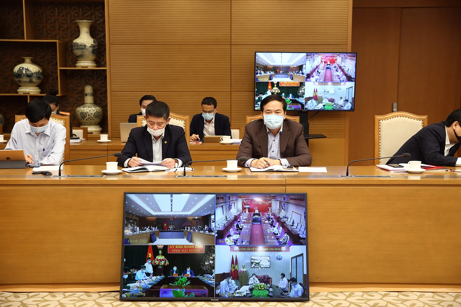 Lãnh đạo tỉnh Hải Dương, Tổ công tác chống dịch của Bộ Y tế báo cáo trực tuyến với Ban Chỉ đạo. Ảnh: VGP/Đình Nam