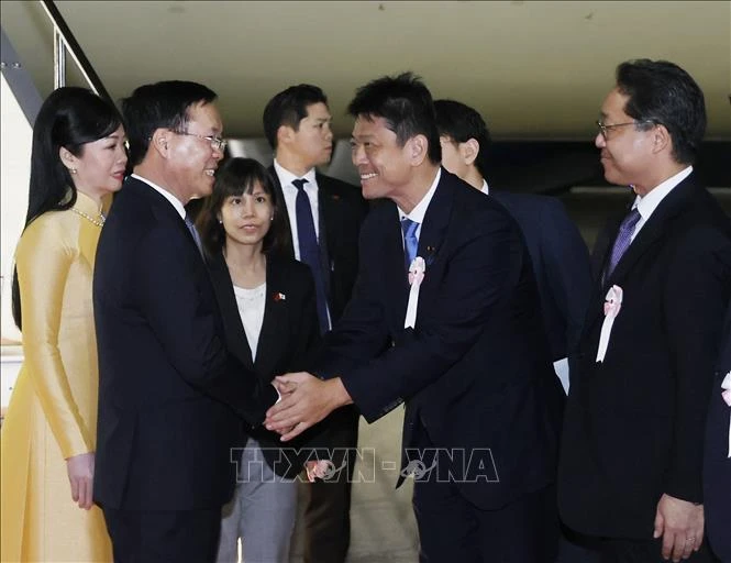 Đón Chủ tịch nước Võ Văn Thưởng và Phu nhân cùng đoàn cấp cao Việt Nam tại sân bay quốc tế Haneda và khách sạn có Đại sứ Nhật Bản tại Việt Nam Yamada Takio và Phu nhân; Lãnh đạo và các quan chức Bộ Ngoại giao Nhật Bản. Về phía Việt Nam có Đại sứ Việt Nam tại Nhật Bản Phạm Quang Hiệu và Phu nhân; cán bộ, nhân viên Đại sứ quán cùng đại diện cộng đồng người Việt Nam đang sinh sống, học tập và làm việc tại Nhật Bản.