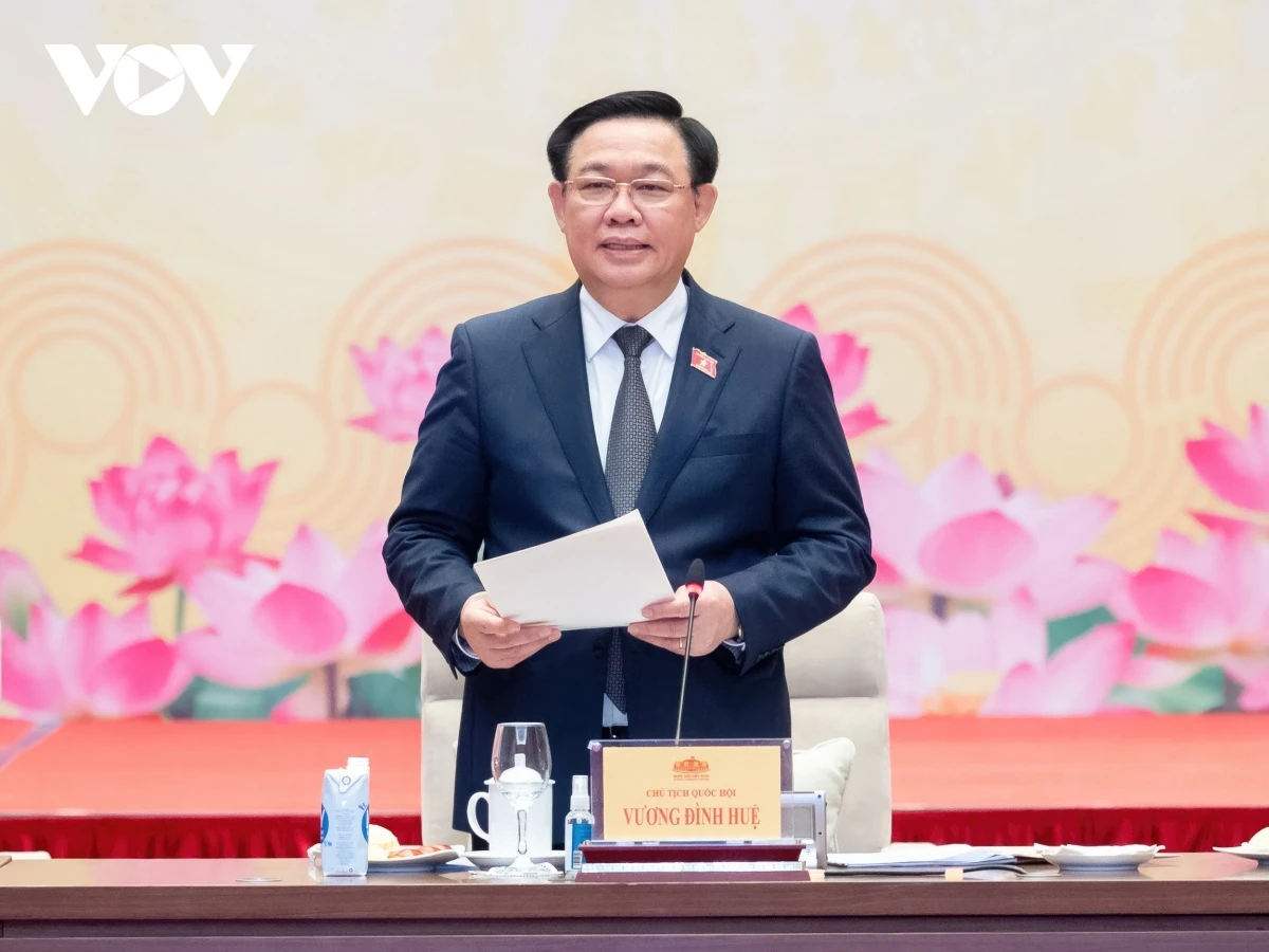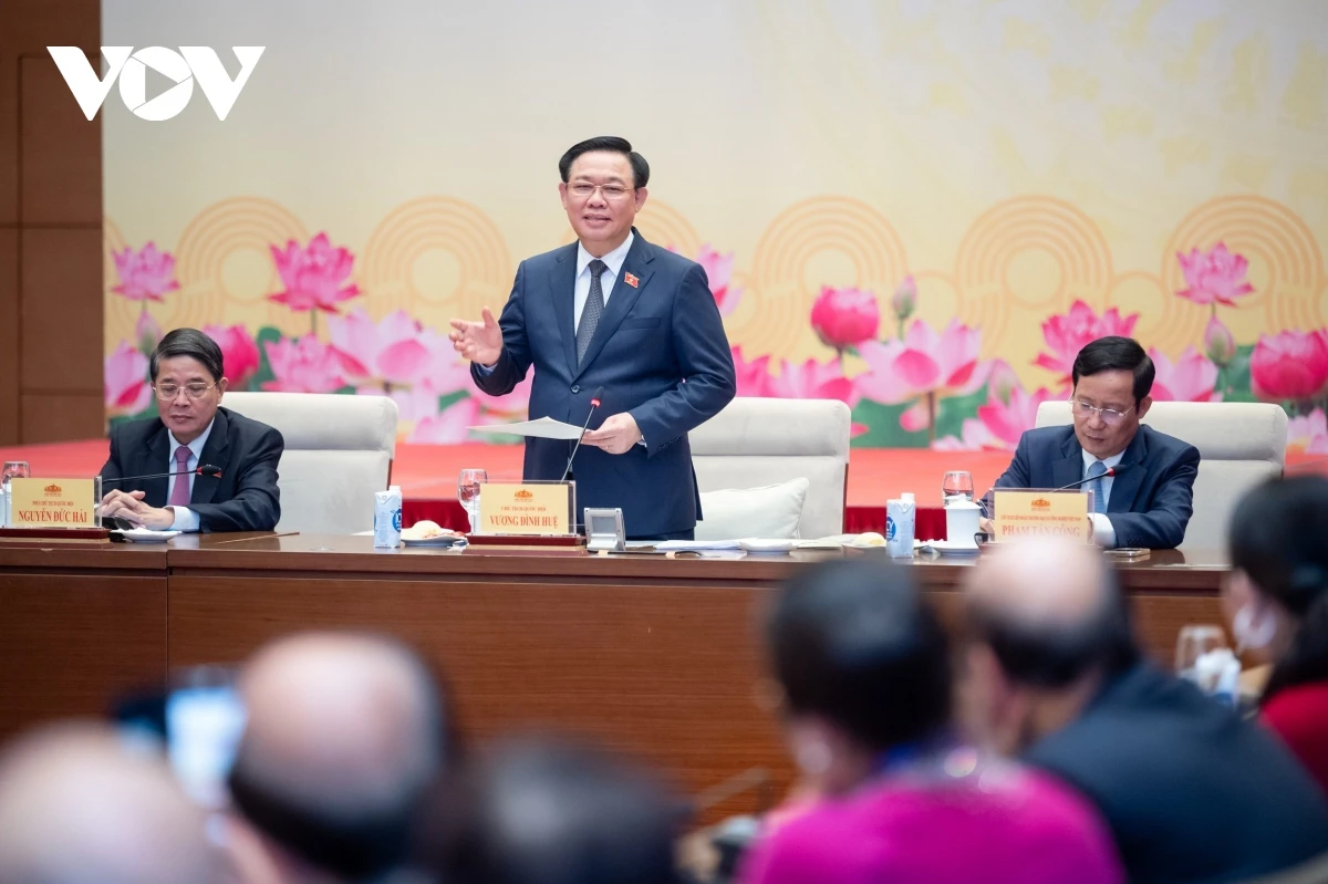 Chủ tịch Quốc hội Vương Đình Huệ phát biểu tại buổi gặp mặt.
