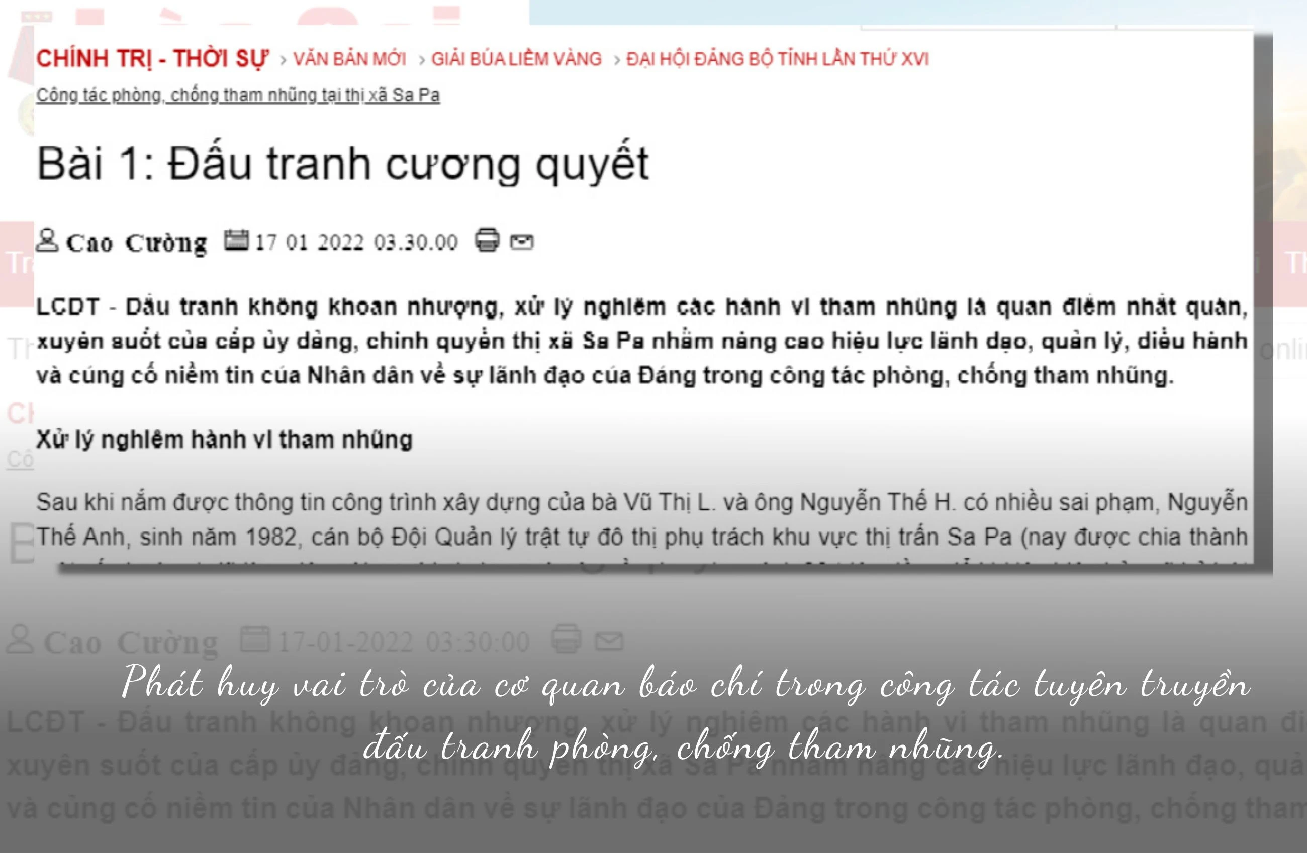 2021 là năm đầu tiên Lào Cai tổ chức “Giải Báo chí với công tác tuyên truyền đấu tranh phòng, chống tham nhũng, lãng phí” và được duy trì hằng năm. Qua đó đẩy mạnh tuyên truyền, nâng cao nhận thức của cán bộ, đảng viên, Nhân dân, đồng thời tôn vinh, khuyến khích nhà báo, cơ quan thông tấn, báo chí trong công cuộc xây dựng, chỉnh đốn Đảng giai đoạn hiện nay, nhất là về công tác đấu tranh phòng, chống tham nhũng, lãng phí.