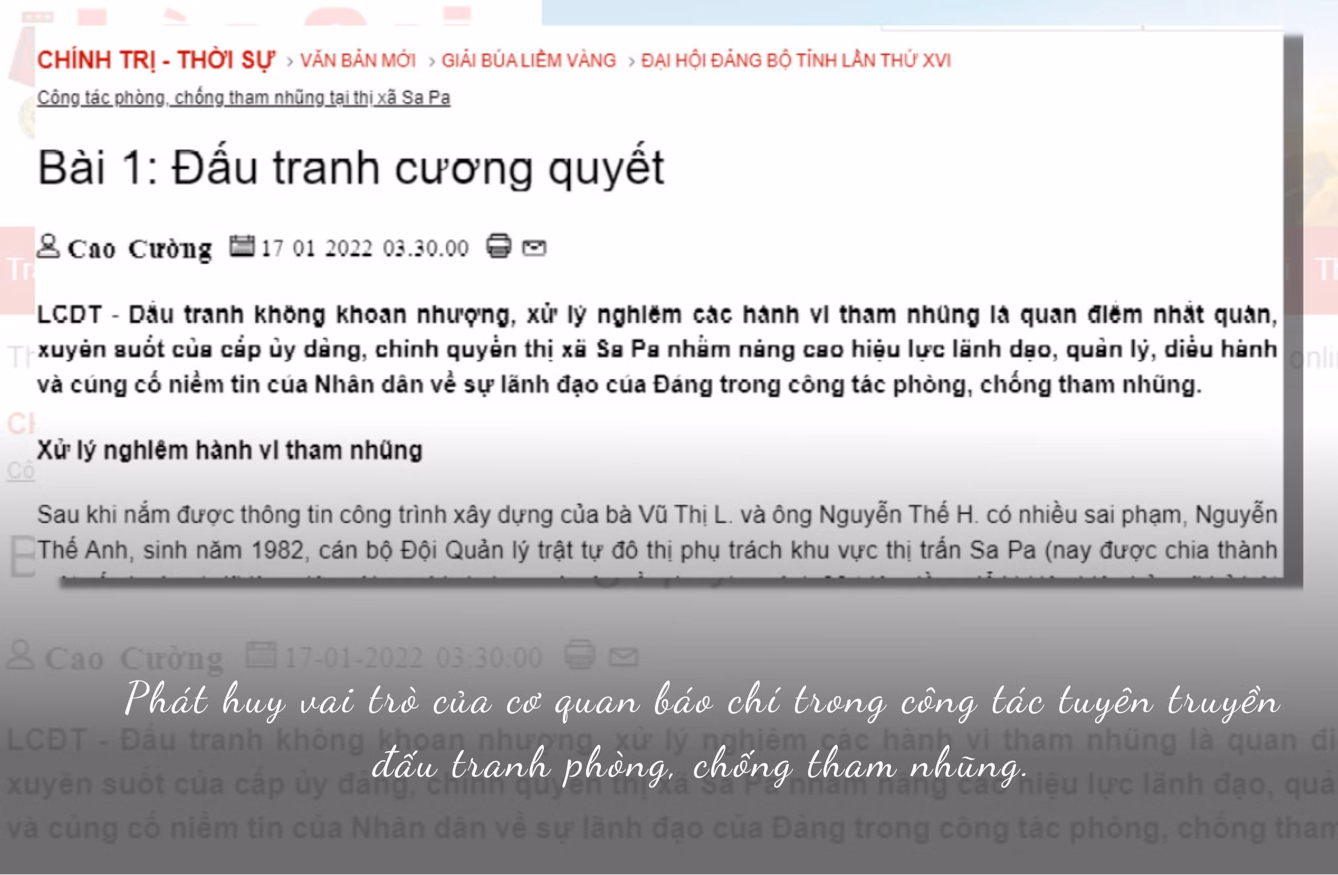 Thời gian qua, công tác tuyên truyền đấu tranh phòng, chống tham nhũng, tiêu cực được cấp ủy đảng, chính quyền, MTTQ, các tổ chức chính trị - xã hội trong tỉnh quan tâm. Trong đó, nội dung tuyên truyền tập trung vào Luật Phòng, chống tham nhũng, Đề án số 16 ngày 11/12/2020 của Ban Chấp hành Đảng bộ tỉnh về “Nâng cao chất lượng, hiệu lực, hiệu quả công tác kiểm tra, giám sát, thi hành kỷ luật Đảng; đảm bảo sự lãnh đạo của Đảng trong công tác đấu tranh phòng, chống tham nhũng trên địa bàn tỉnh Lào Cai, giai đoạn 2020 - 2025”; việc triển khai thực hiện Nghị quyết Trung ương 4 (khóa XI, XII, XIII); Kết luận 21 của Ban Chấp hành Trung ương Đảng và Chỉ thị 05 của Bộ Chính trị về đẩy mạnh học tập, làm theo tư tưởng, đạo đức, phong cách Hồ Chí Minh.