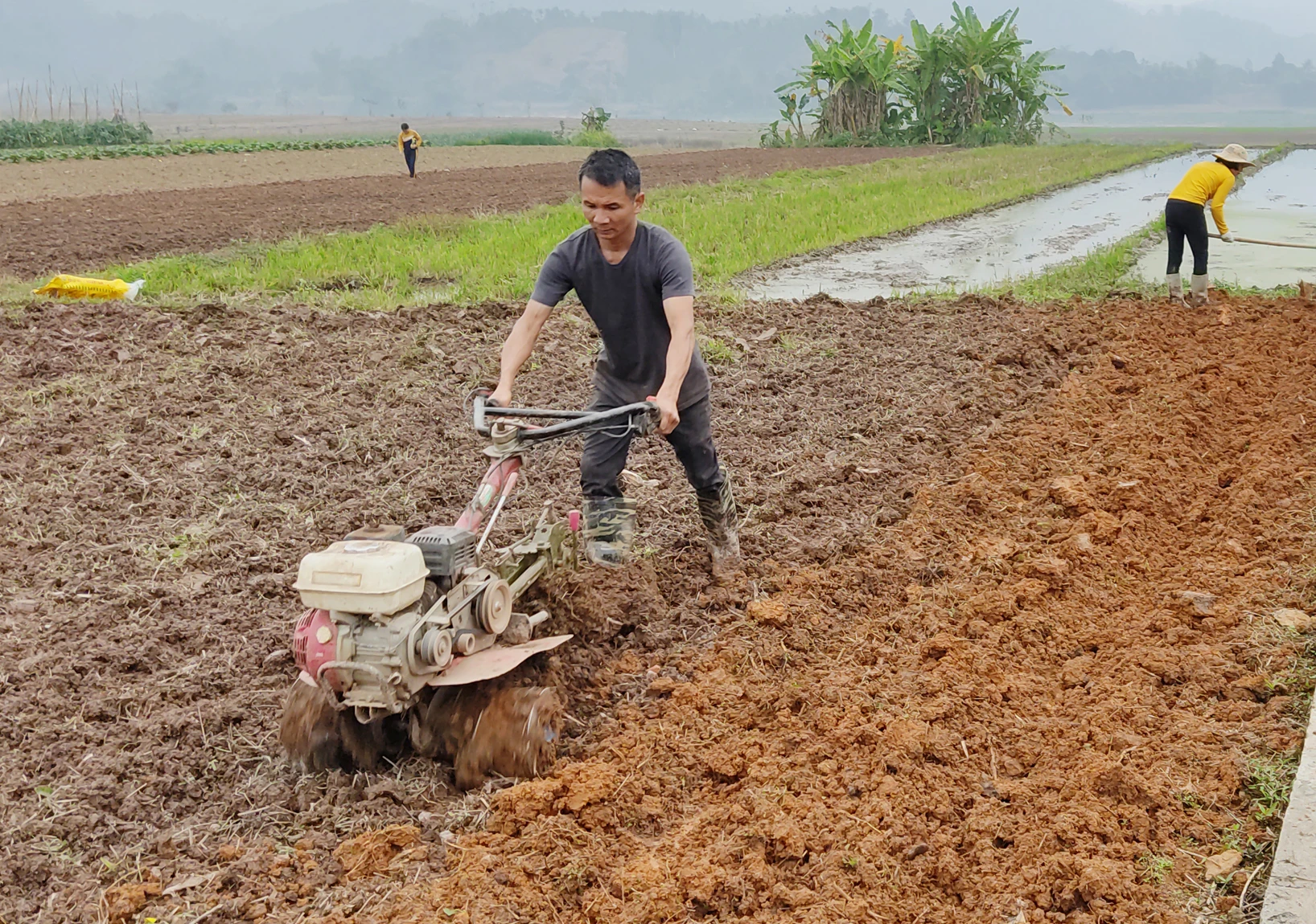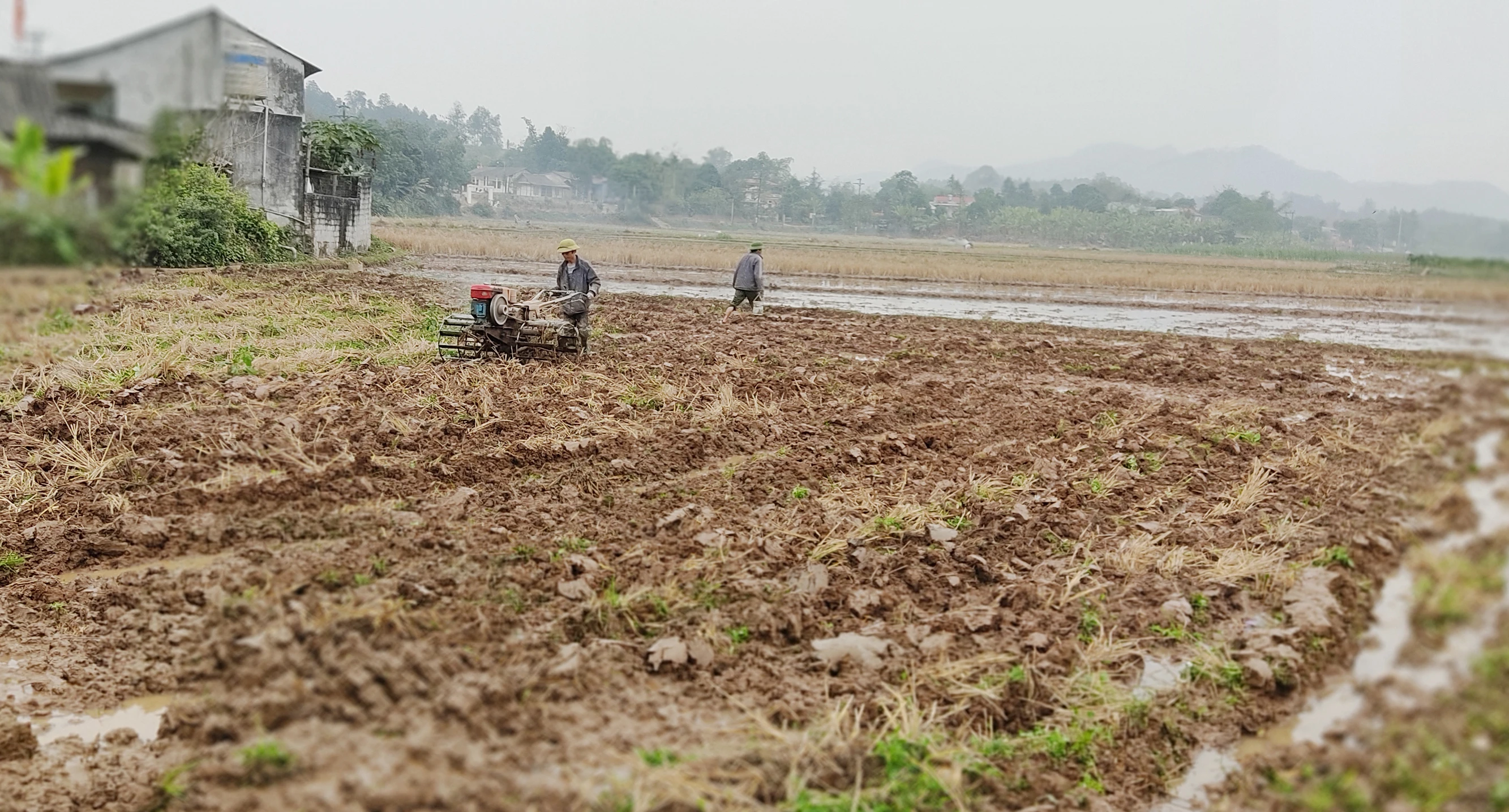 Nông dân Bảo Thắng làm đất gieo cấy lúa vụ xuân.