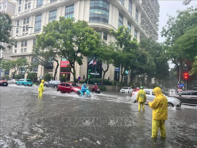 Lực lượng chức năng ứng trực tiêu thoát nước trên đường Lý Thường Kiệt, quận Hoàn Kiếm, sáng 5/6. Ảnh: TTXVN phát