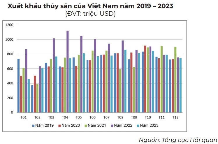Xuất khẩu thủy sản năm 2023 giảm mạnh chủ yếu do so với mức cao kỷ lục đạt được trong 8 tháng đầu năm 2022, khi các nhà nhập khẩu đẩy mạnh mua hàng nhằm đối phó với tình trạng đứt gãy chuỗi cung ứng. Tháng 11 và 12/2023, xuất khẩu thủy sản của Việt Nam đã gần như tương đương so với cùng kỳ năm 2022.