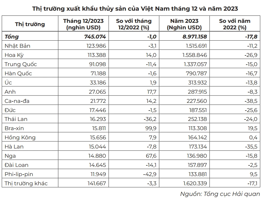 Theo thống kê của Tổng cục Hải quan, tháng 12/2023, xuất khẩu thủy sản của Việt Nam đạt 745,1 triệu USD, giảm 1% so với tháng 12/2022. Tính chung cả năm 2023, xuất khẩu thủy sản của Việt Nam đạt 8,97 tỷ USD, giảm 17,8% so với năm 2022.