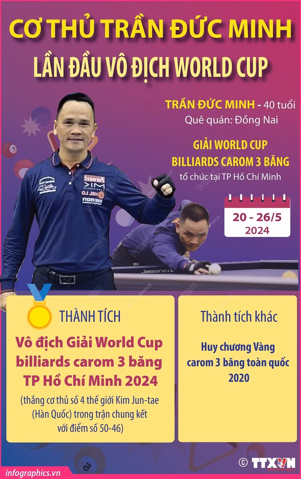 Cơ thủ Trần Đức Minh đã xuất sắc đánh bại đối thủ hạng 4 thế giới Kim Jun Tae (Hàn Quốc) trong trận chung kết để giành chức vô địch World Cup billiards carom 3 băng Thành phố Hồ Chí Minh 2024.