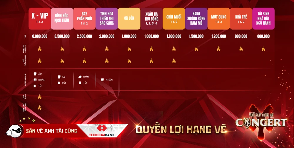 Khán giả sẽ có quyền lợi khác nhau tương ứng với từng hạng vé, chẳng hạn khu vực VIP có bàn ghế để thưởng thức cocktail, đồ ăn tiêu chuẩn 5 sao, được nhận các vật phẩm như áo, mũ, túi, khăn, thẻ thông hành và vòng tay check-in.