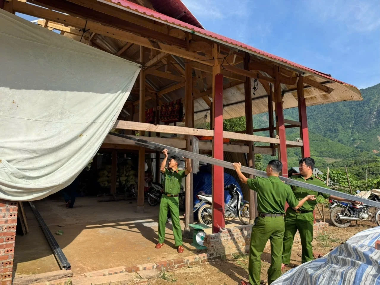 Công an xã Cốc Lầu giúp dân lợp lại mái nhà sau dông lốc