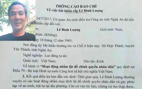 Chiều tối 24/7, Công an tỉnh Nghệ An phát đi thông cáo báo chí về việc cơ quan điều tra Công an tỉnh Nghệ An bắt khẩn cấp ông Lê Đình Lượng (52 tuổi, ngụ xã Hợp Thành, huyện Yên Thành, Nghệ An) để điều tra về hành vi “hoạt động nhằm lật đổ chính quyền nhân dân”, theo điều 79 Bộ luật Hình sự.