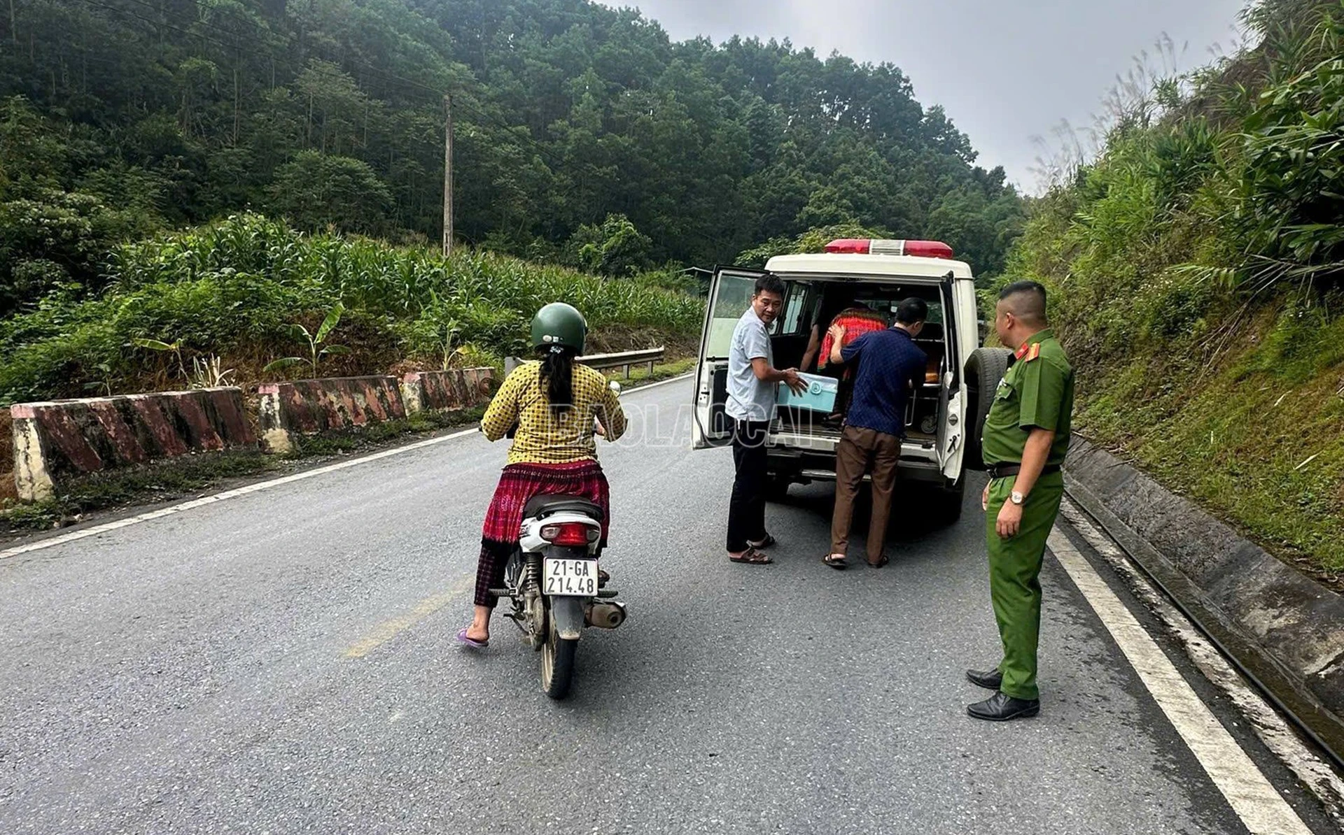 Qua thăm hỏi, được biết chị tên là Xê, trú tại xã Hưng Khánh, tỉnh Lào Cai, đang được người nhà chở bằng xe máy đến bệnh viện thăm khám. Do đau bụng dữ dội khiến chị Xê không thể tiếp tục ngồi trên xe máy, người nhà buộc phải để chị nằm nghỉ bên đường.