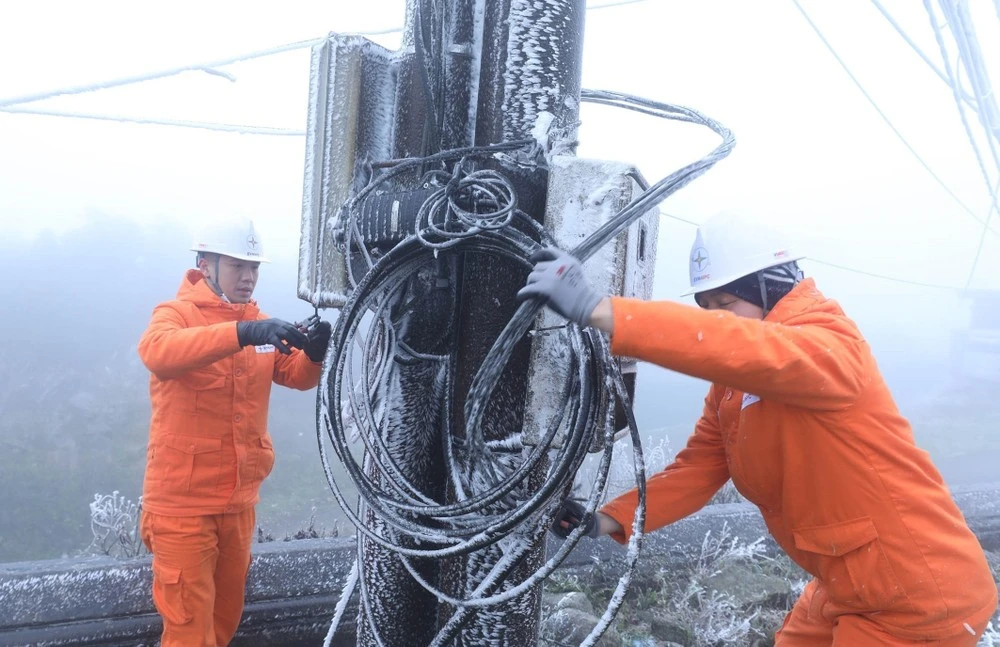 Nhân viên Điện lực Lộc Bình kiểm tra lưới điện tại Khu du lịch Mẫu Sơn ngày băng giá bao phủ.
