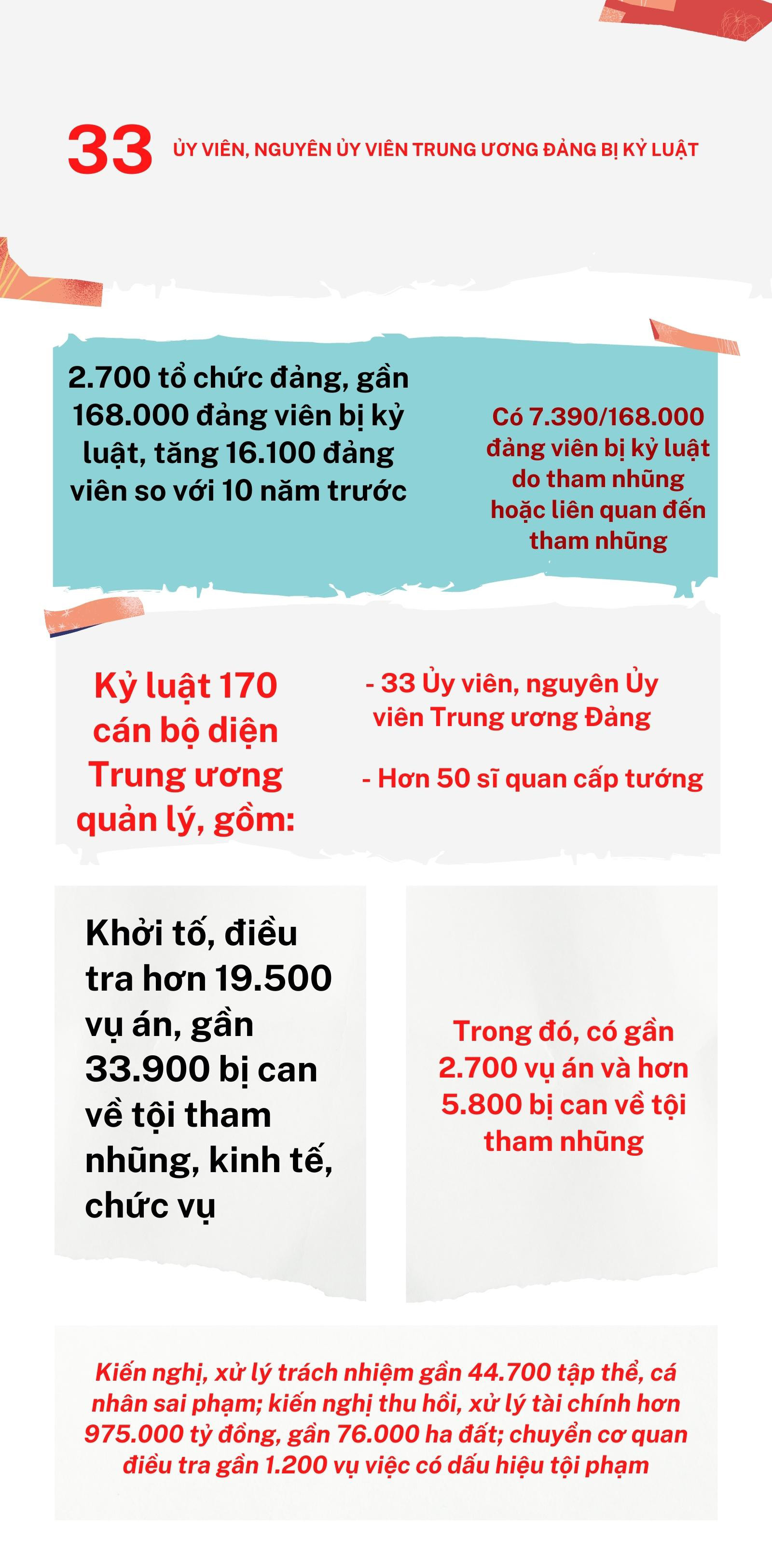 Trong 10 năm qua, cấp ủy, ủy ban kiểm tra các cấp đã thi hành kỷ luật hơn 2.700 tổ chức đảng, gần 168.000 đảng viên (tăng 16.000 đảng viên so với 10 năm trước), trong đó hơn 7.390 đảng viên bị kỷ luật do tham nhũng hoặc liên quan đến tham nhũng. Trung ương, Bộ Chính trị, Ban Bí thư, Ủy ban Kiểm tra Trung ương đã kỷ luật hơn 170 cán bộ diện Trung ương quản lý, trong đó có 33 Ủy viên, nguyên Ủy viên Trung ương Đảng, hơn 50 sĩ quan cấp tướng. Riêng từ đầu nhiệm kỳ Đại hội XIII của Đảng đến nay đã kỷ luật 50 cán bộ diện Trung ương quản lý.