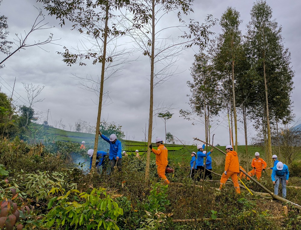 Công nhân PC Yên Bái và đoàn viên thanh niên huyện Văn Chấn ra quân phát dọn hành lang an toàn lưới điện tại thị trấn Nông Trường Liên Sơn, huyện Văn Chấn.