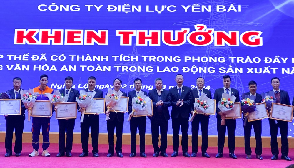 Nhân dịp này, PC Yên Bái đã tặng giấy khen cho các tập thể có thành tích trong công tác đẩy mạnh xây dựng văn hóa an toàn trong laođộng sản xuất và phong trào thi đua giảm tổn thất điện năng năm 2023; khenthưởng các tập thể có thành tích trong công tác quản lý vận hành, kinh doanhdịch vụ khách hàng, an toàn phòng cháy chữa cháy, đảm bảo cung cấp điện liêntục, ổn định trong dịp Tết Nguyên đán Giáp Thìn 2024 (ảnh trên).