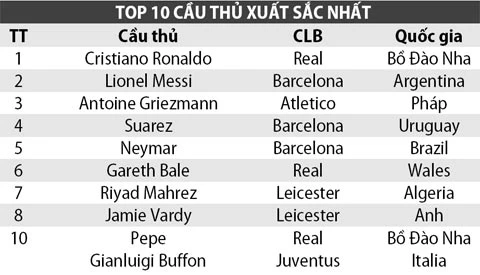 Siêu sao Cristiano Ronaldo (Real) đã trở thành chủ nhân của danh hiệu Quả bóng vàng 2016 do tạp chí France Football bầu chọn. Trong khi đó, Lionel Messi (Barca) ngậm ngùi đoạt Quả bóng bạc, còn tiền đạo Antoine Griezmann (Atletico) giành Quả bóng đồng.