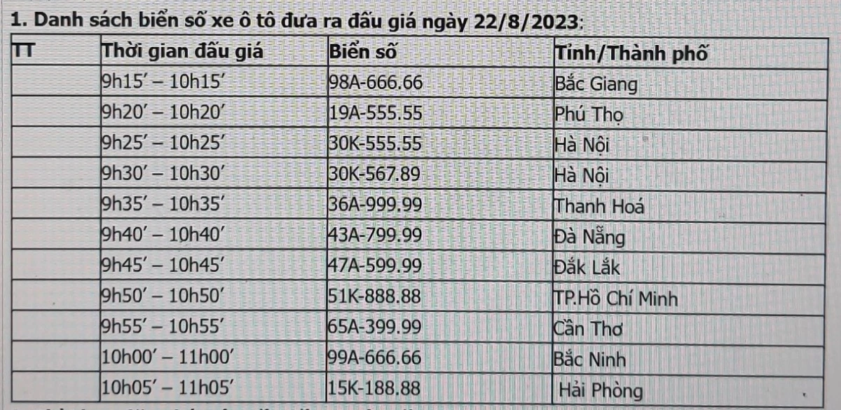 Theo thông báo của Công ty Đấu giá hợp danh Việt Nam, sẽ có 11 biển số xe ôtô của 10 tỉnh, thành phố (Bắc Giang, Hà Nội, Phú Thọ, Thanh Hóa, Đà Nẵng, Đắk Lắk, Thành phố Hồ Chí Minh, Cần Thơ, Bắc Ninh, Hải Phòng) được đưa ra đấu giá. Thời gian đấu giá: 60 phút/biển số xe ô tô. Danh sách các biển số đưa ra đấu giá được thông báo công khai trên trang thông tin đấu giá trực tuyến tại địa chỉ https://vpa.com.vn.