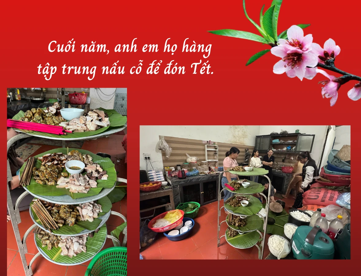 Mâm cỗ cúng tất niên được đồng bào Dao đỏ ở đây đặc biệt chú ý, ngoài bánh chưng, bánh gù đặc trưng của người Dao, thịt lợn, thịt gà, rượu…, còn có thêm đĩa bánh dày hoặc bánh nếp gói trong lá chít và tiền vàng mã. Độc đáo ở chỗ, cũng là tiền vàng mã nhưng lại không cầu kỳ, tốn kém mà vẫn có những quan niệm riêng, đức tin riêng. Gốc gác của người Dao xưa kia tiêu loại tiền xu có lỗ thủng ở giữa và được xâu lại thành từng xâu.