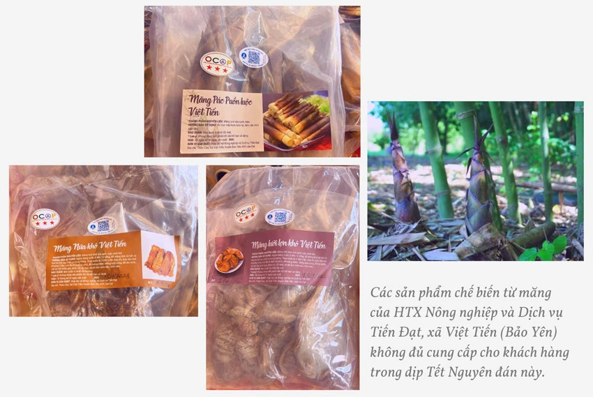 Cùng với thịt trâu sấy, các sản phẩm chế biến từ măng của huyện Bảo Yên cũng là thứ đặc sản đang được tiêu thụ mạnh. Những ngày này, các thành viên của Hợp tác xã Nông nghiệp và Dịch vụ Tiến Đạt tại xã Việt Tiến đang gấp rút hoàn thiện các đơn hàng để chuyển đi cho các đại lý tiêu thụ dịp Tết.