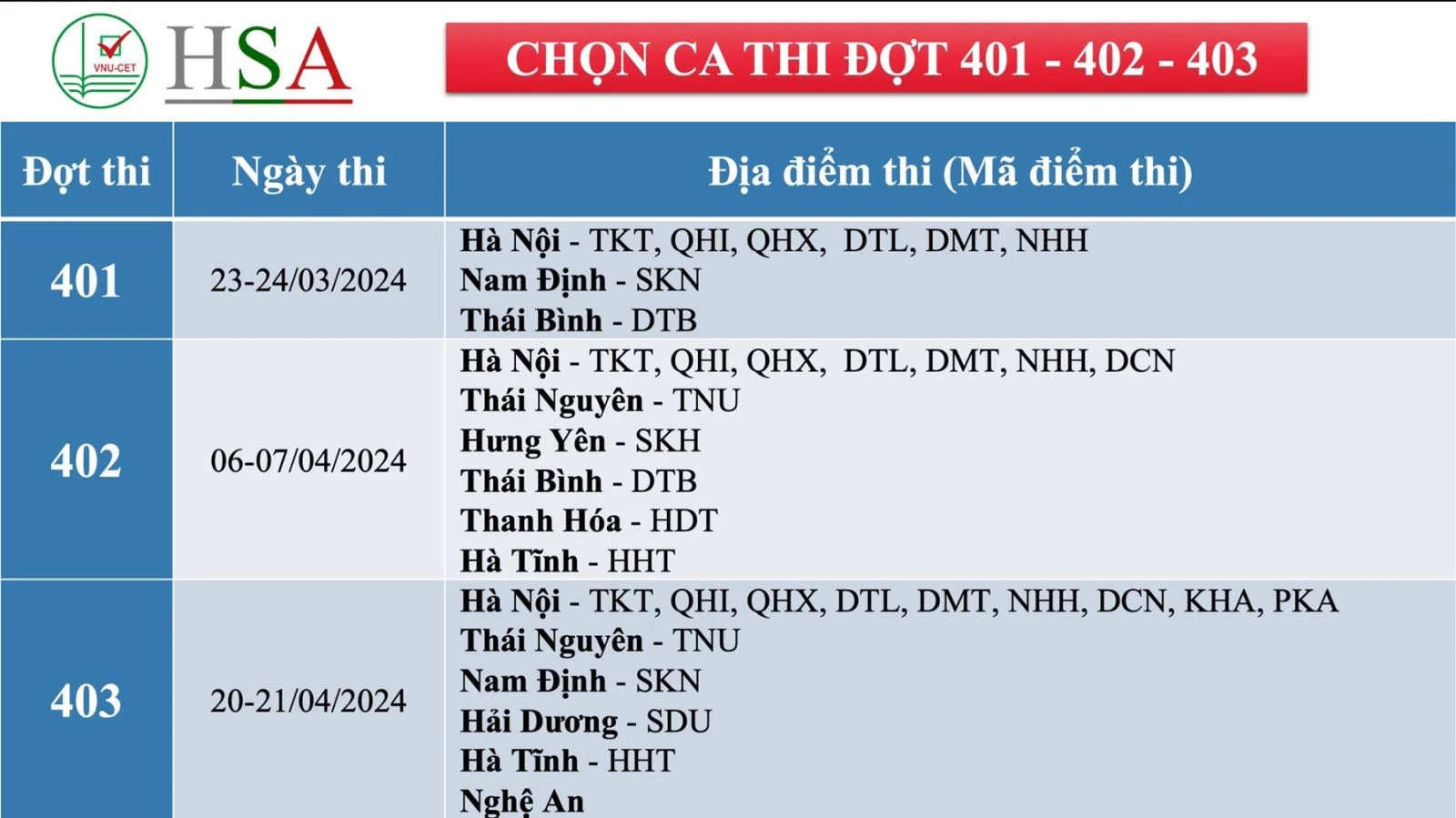 Trung tâm Khảo thí ĐH Quốc gia Hà Nội sẽ tổ chức thi từ 23/3 đến 2/6/2024, tại Hà Nội, Thái Nguyên, Hưng Yên, Hải Dương, Nam Định, Thái Bình, Hải Phòng, Thanh Hóa, Nghệ An, Hà Tĩnh.