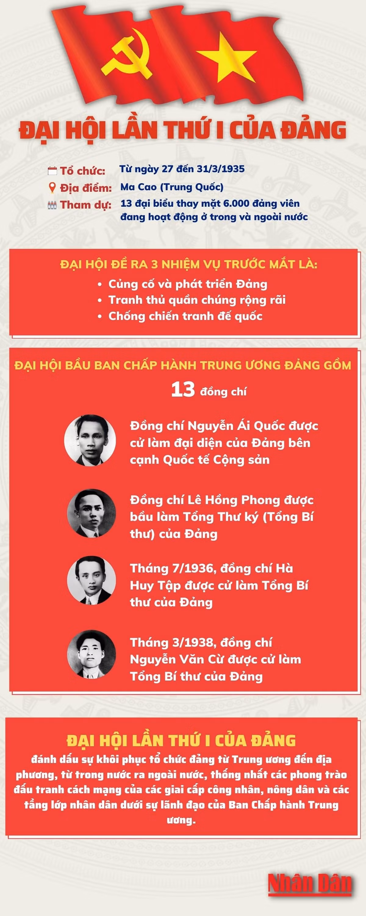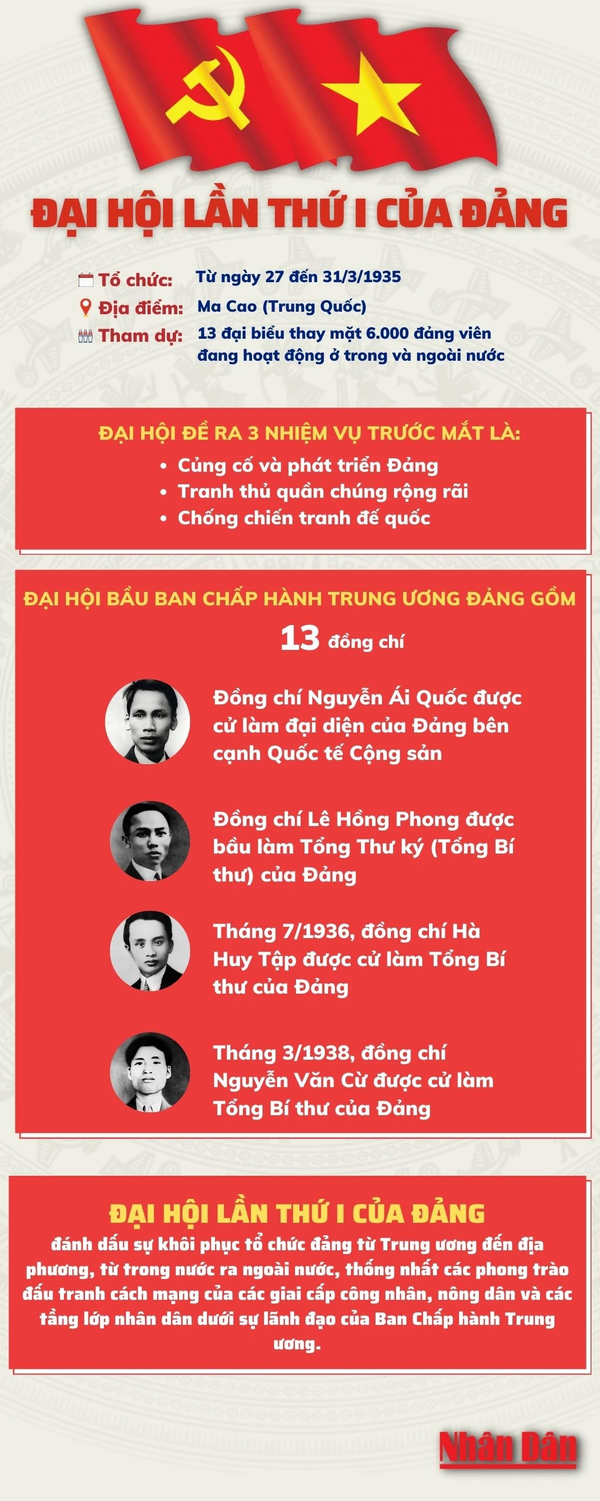Đại hội lần thứ I của Đảng được tổ chức từ ngày 27 đến 31/3/1935 tại Ma Cao (Trung Quốc), với sự tham dự của 13 đồng chí đại biểu thay mặt 6.000 đảng viên đang hoạt động ở trong và ngoài nước.