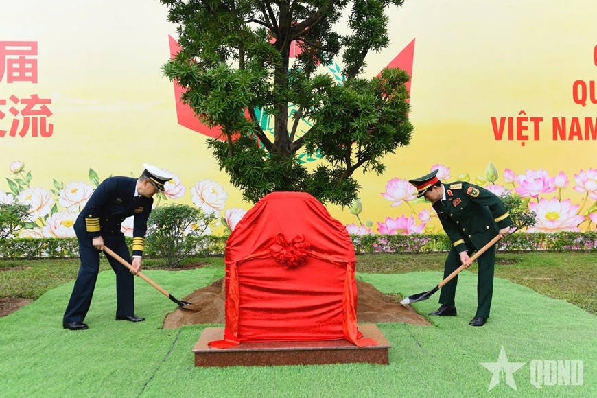 Hai Bộ trưởng đã cùng trồng cây hữu nghị trong khuôn viên Cửa khẩu Quốc tế Móng Cái và chụp ảnh lưu niệm cùng các đại biểu hai đoàn Việt Nam, Trung Quốc.