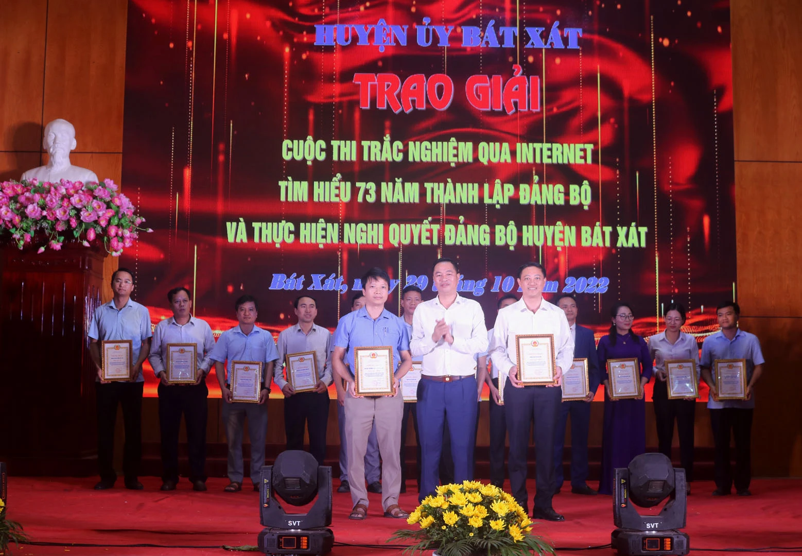 Nhân dịp này, Huyện ủy Bát Xát đã tổ chức trao giải cho các tập thể, cá nhân đoạt giải Cuộc thi trắc nhiệm trên Internet tìm hiểu lịch sử Đảng bộ huyện và Nghị quyết Đại hội Đảng bộ huyện Bát Xát lần thứ XXIII, nhiệm kỳ 2020 - 2025 (ảnh trên).