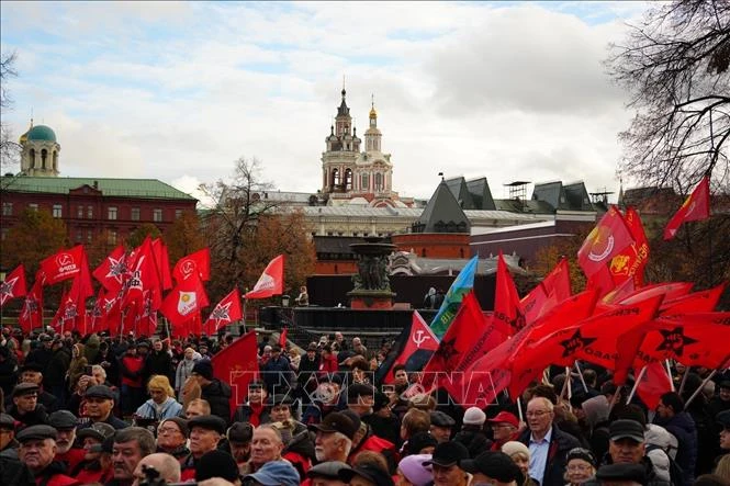 Hàng nghìn người tham dự lễ mít tinh kỷ niệm 106 năm Cách mạng Tháng Mười vĩ đại tại thủ đô Moskva.