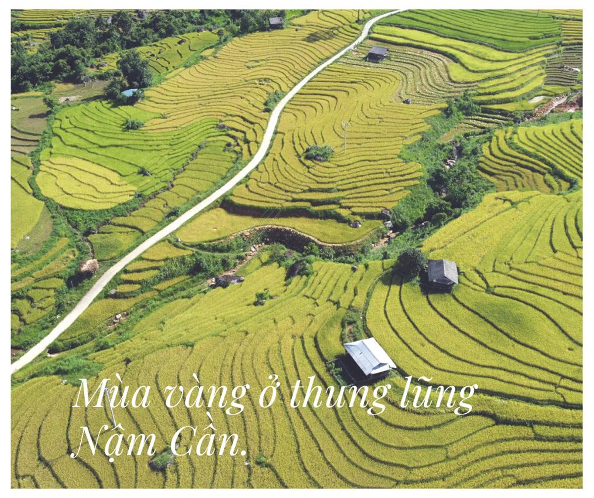 Trong vô vàn bức ảnh mùa lúa vàng tràn ngập trên các phương tiện thông tin đại chúng và mạng xã hội, chúng tôi bị cuốn hút bởi tràn ruộng vàng óng men dòng suối rồi kéo tít tắp tận chân trời, giữa tràn ruộng là con đường bê tông uốn lượn nối lên khu dân cư trù phú - đó là hình ảnh của thôn Nậm Cần bên dòng Nậm Khắt hôm nay. Nậm Cần nằm ở vị trí ngược đường so với các thôn khác ở Dần Thàng, muốn đến đây phải đi theo đường lên xã Nậm Chày. Trước đây đến Nậm Cần, chúng tôi phải ì ạch gần tiếng đồng hồ cho chặng đường chừng hơn chục cây số. Từ khi tuyến đường Dương Quỳ - Nậm Chày được đầu tư đã giúp việc đi lại, trao đổi hàng hóa của người dân nơi đây thuận lợi hơn.