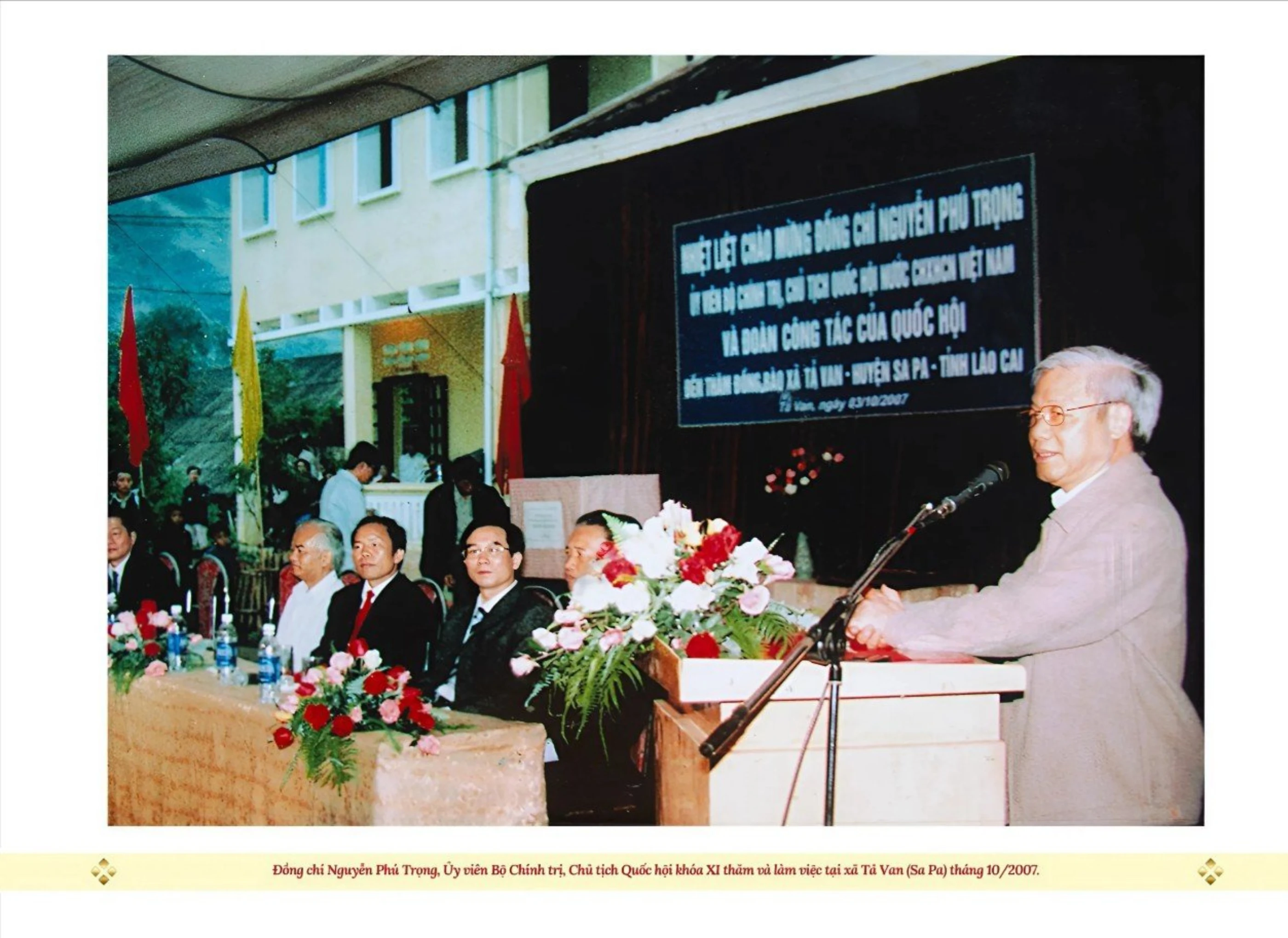Trở lại thời điểm cách đây 17 năm, đó là ngày 3 - 4/10/2007, trong chuyến thăm và làm việc tại 3 tỉnh Tây Bắc, Ủy viên Bộ Chính trị, Chủ tịch Quốc hội Nguyễn Phú Trọng và Đoàn công tác của Quốc hội đã đến thăm và làm việc với tỉnh Lào Cai. Trong khuôn khổ chuyến công tác, Chủ tịch Quốc hội Nguyễn Phú Trọng tranh thủ tối đa khoảng thời gian ngắn ngủi để đến thăm, động viên, nắm tình hình tại các cơ quan, đơn vị của tỉnh, đó là xã Tả Van, huyện Sa Pa (nay là thị xã Sa Pa); dâng hương tại đền Thượng; thăm Cửa khẩu Quốc tế Lào Cai; Trung tâm thương mại quốc tế Lào Cai; Dự án Khu Thương mại Kim Thành; Trường THPT Dân tộc nội trú tỉnh; Cụm Công nghiệp Tằng Loỏng thuộc huyện Bảo Thắng; Khu Đô thị mới Lào Cai - Cam Đường; Bộ Chỉ huy Quân sự tỉnh. Cuối cùng, Chủ tịch Quốc hội dành thời gian làm việc với lãnh đạo Tỉnh ủy, HĐND, UBND, Đoàn đại biểu Quốc hội, Ủy ban MTTQ tỉnh và cán bộ các ban, sở, ngành của tỉnh Lào Cai.