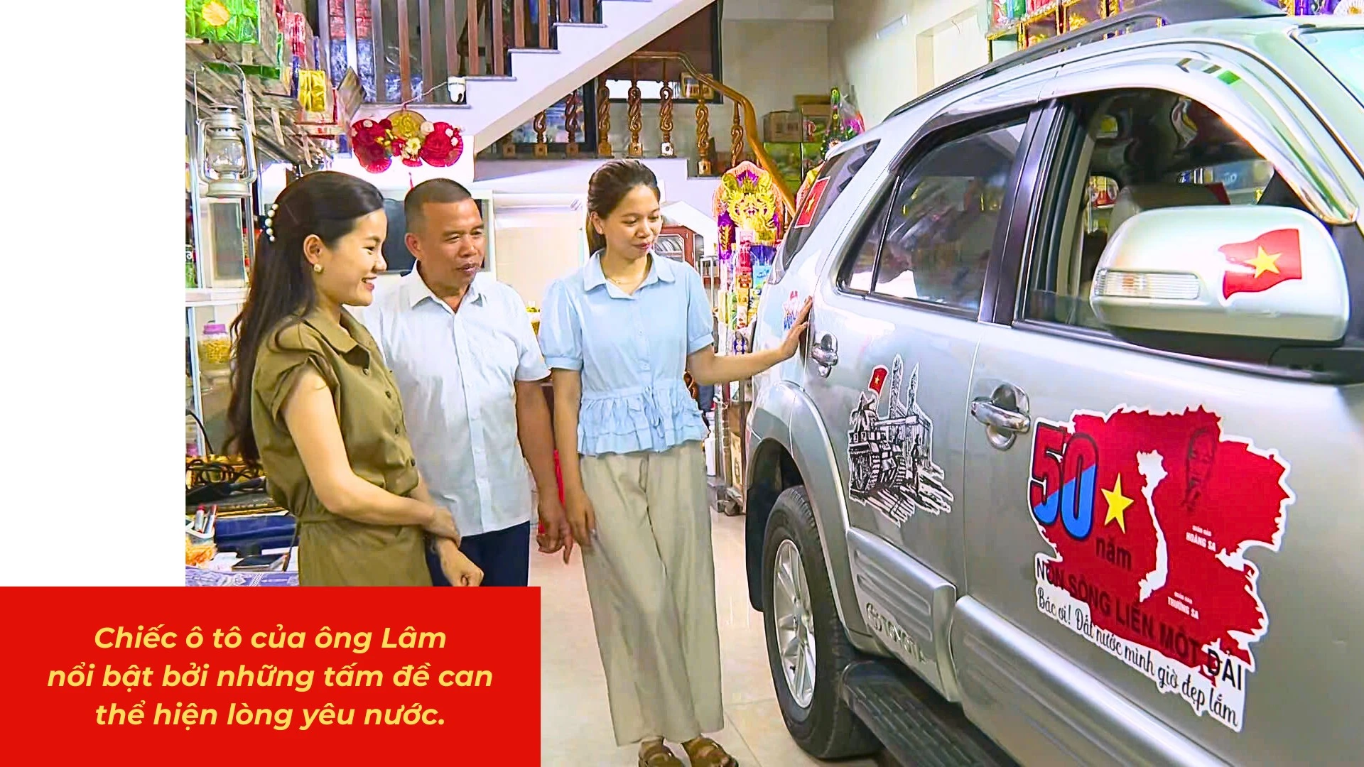Khi chúng tôi đến thăm nhà cũng là lúc ông Lâm vừa đỗ xe trước cửa. Chiếc ô tô nổi bật bởi những tấm đề can thể hiện lòng yêu nước. Đó là dòng chữ “Mừng 50 năm giải phóng miền Nam, thống nhất đất nước”, hình lá cờ đỏ sao vàng, hình chiếc xe tăng tiến vào Dinh Độc Lập…
