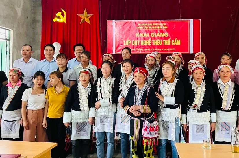 Học viên tham gia lớp dạy nghề thêu thổ cẩm tại huyện Bát Xát, tháng 5/2023.