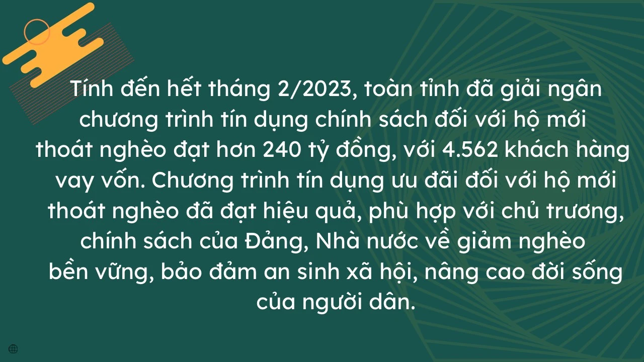 | Chương trình cho vay vốn hộ mới thoát nghèo được triển khai thực hiện theo Quyết định 28/2015/QĐ-TTg của Thủ tướng Chính phủ. Đối tượng được vay vốn là những hộ đã từng là hộ nghèo, hộ cận nghèo, với mức cho vay 50 triệu đồng/hộ. Năm 2019, chương trình này được nâng mức cho vay lên 100 triệu đồng/hộ, không phải bảo đảm tiền vay. Thời hạn cho vay do ngân hàng và hộ mới thoát nghèo thỏa thuận trên cơ sở chu kỳ sản xuất, kinh doanh và khả năng trả nợ của khách hàng nhưng không quá 10 năm. |