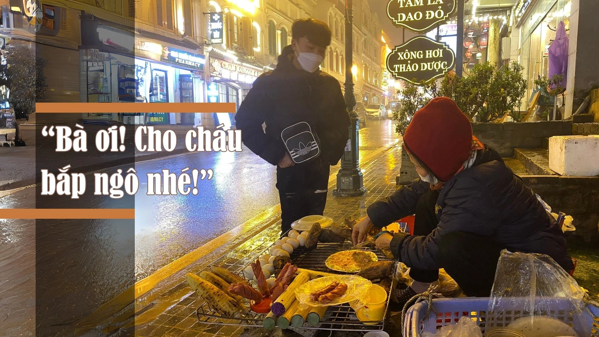9 giờ tối, nhiệt độ Sa Pa dưới 100C, sương rơi và gió rít lên từng cơn lạnh buốt. Khu vực trung tâm thị xã như nhà thờ đá, sân Quần hoặc bờ hồ Sa Pa không còn náo nhiệt như ban ngày. Nhiều ngôi nhà đã đóng cửa, những chiếc xe lao qua đường cũng vội vã để nhanh chóng trở về với tổ ấm gia đình, chỉ còn lại ánh sáng lung linh từ trung tâm thương mại, đèn đường và các biển quảng cáo hắt ra. Vài du khách ngồi quây quần bên hàng nước hay quán đồ nướng với ánh sáng vàng vọt từ chiếc đèn tích điện hay bếp than tạo nên những góc nhỏ mang lại cảm giác ấm cúng. Khung cảnh này khiến tôi nhớ đến những lời bài hát về Sa Pa: “Ơi Sa Pa! Thành phố trong sương… bốn mùa mây bay gió lạnh”. Để tận hưởng gió lạnh và sự lãng mạn của đêm đông Sa Pa, chúng tôi quyết định đi bộ xuống phố Cầu Mây. Trên đường, chúng tôi gặp từng nhóm du khách che ô đi chầm chậm, tuyến phố đi bộ này có lẽ là nơi nhộn nhịp nhất trong đêm mưa.