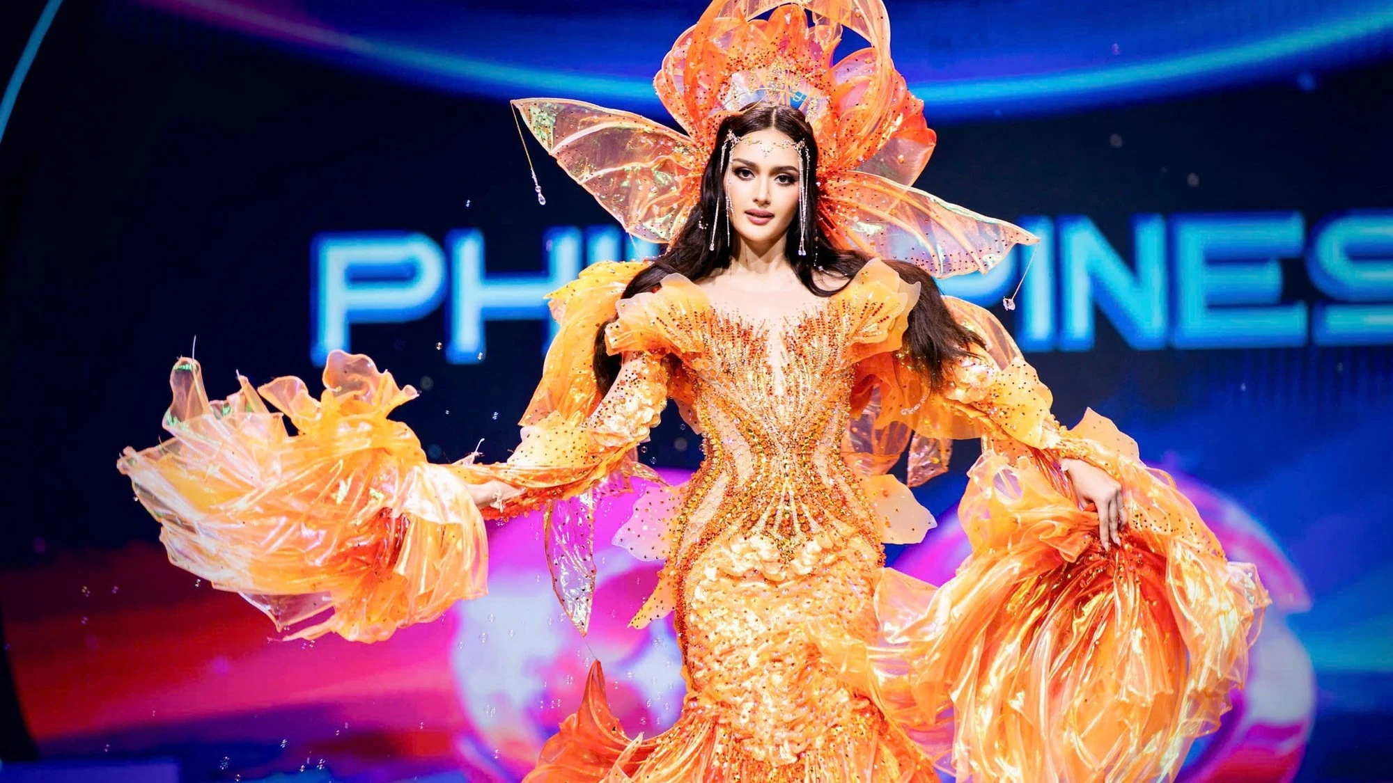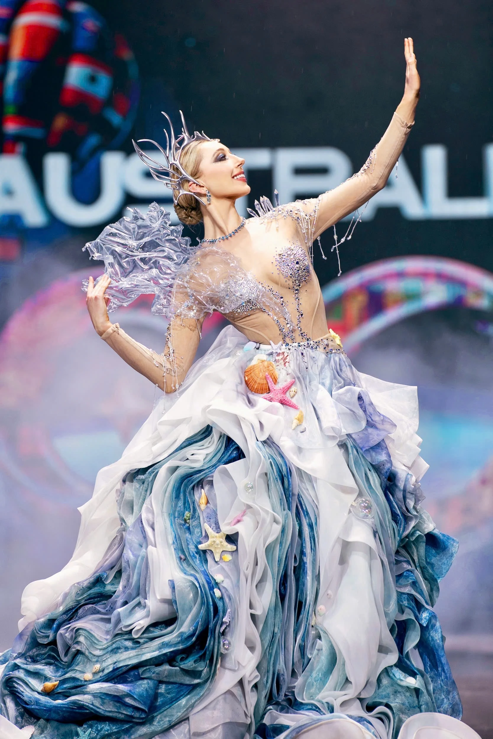 Miss Cosmo Úc với bộ trang phục dân tộc lấy cảm hứng từ đại dương bao la, điểm nhấn là các sinh vật ở biển đính kết trên đầm.