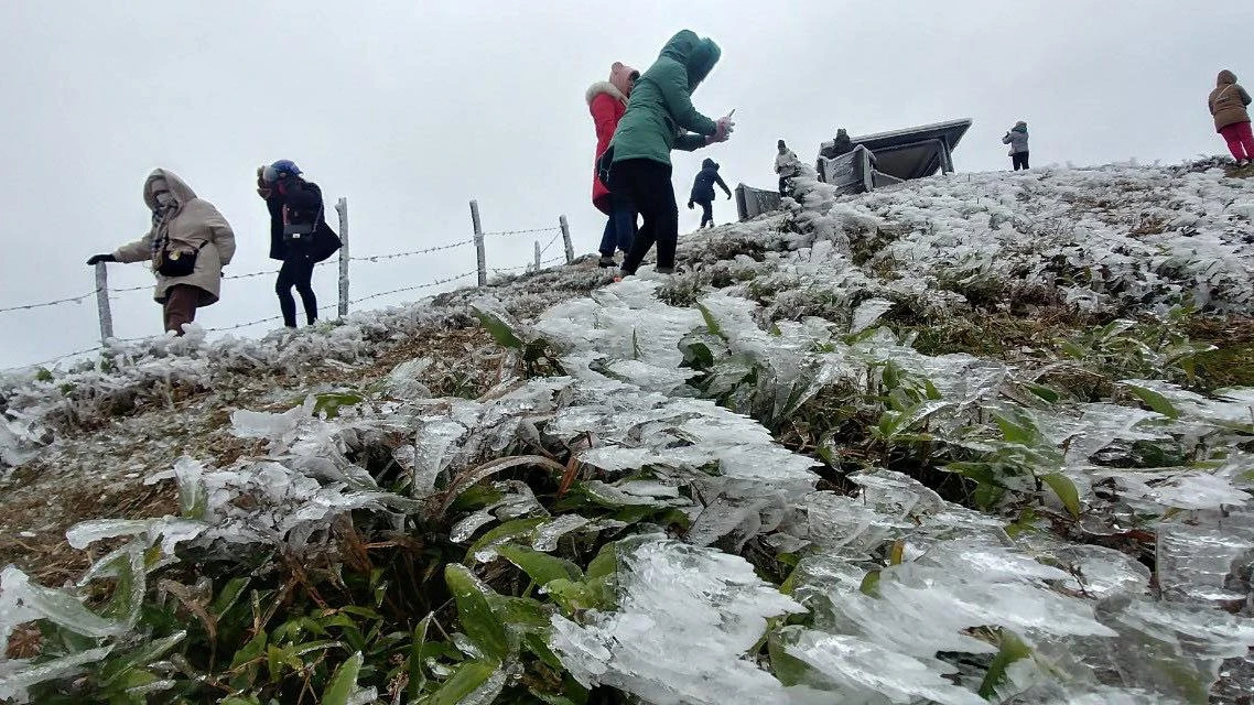 Du khách săn băng tuyết trên đỉnh Mẫu Sơn.