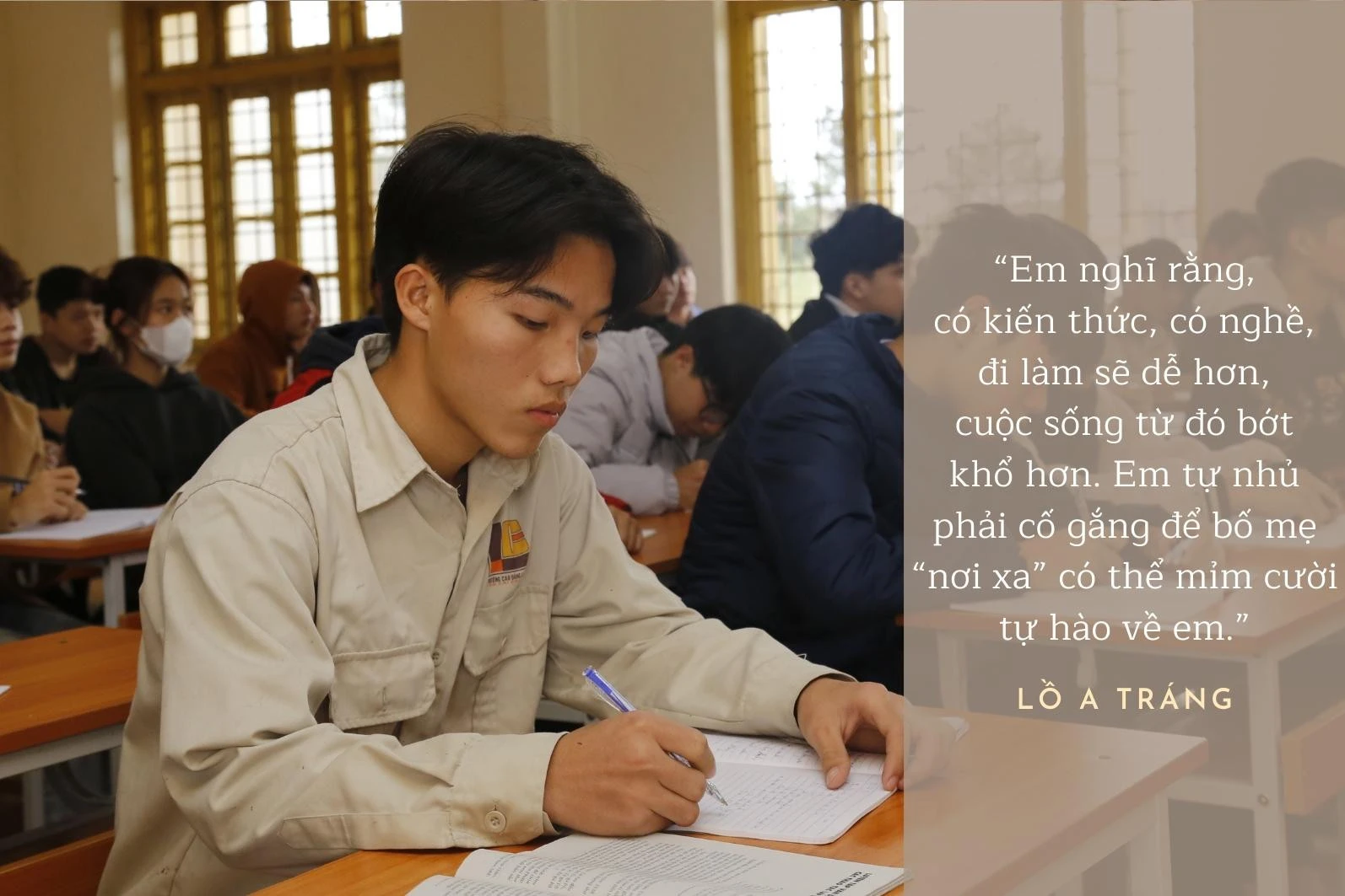 Cùng hoàn cảnh như Phòng, Lồ A Tráng, ở xã Sín Chéng (huyện Si Ma Cai), sinh viên năm thứ 2, lớp cơ khí động lực Trường Cao đẳng Lào Cai cũng chịu cảnh mồ côi cả cha và mẹ từ khi còn bé. Lên 5 tuổi, do hoàn cảnh gia đình quá khó khăn, trước khi đi làm xa, người anh cả đã phải gửi Tráng vào Trung tâm Công tác xã hội tỉnh. Được sự chăm sóc, dạy bảo của các “mẹ” tại trung tâm, Tráng luôn ý thức rằng phải học để ra trường có nghề ổn định, tự chăm sóc cho bản thân. Tráng tâm sự: Em nghĩ rằng, có kiến thức, có nghề, đi làm sẽ dễ hơn, cuộc sống từ đó bớt khổ hơn. Em tự nhủ phải cố gắng để bố mẹ “nơi xa” có thể mỉm cười tự hào về em.